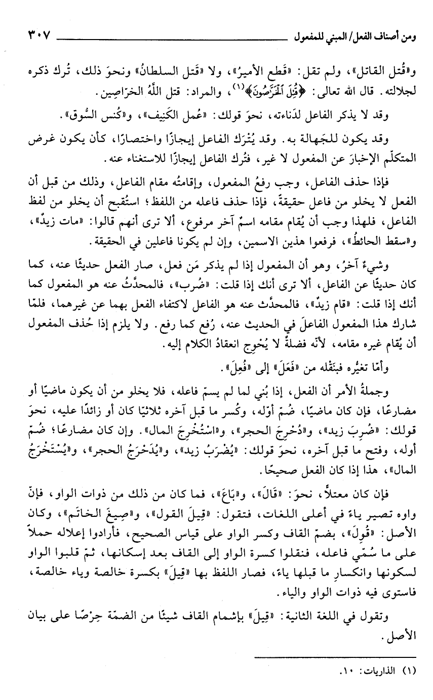 وقد يكون للجَهالة به. وقد يُتْرَك الفاعل إيجازًا واختصارًا، كأن يكون غرض المتكلم الإخبارَ عن المفعول لا غير، فتُرك الفاعل إيجازًا للاستغناء عنه.