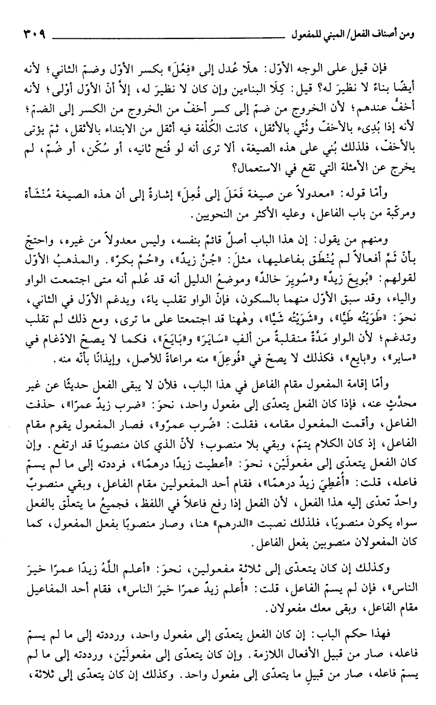 فهذا حكم الباب: إن كان الفعل يتعدّي إلى مفعول واحد، ورددته إلى ما لم يسم فاعله، صار من قبيل الأفعال اللازمة. وإن كان يتعدّي إلى مفعولَيْن، ورددته إلى ما لم يسمّ فاعله، صار من قبيلِ ما يتعدّي إلى مفعول واحد. وكذلك إن كان يتعدّي إلى ثلاثة،