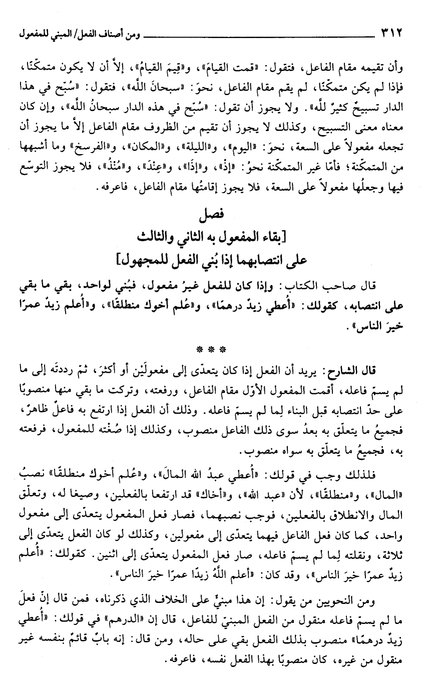 قال الشارح: يريد أن الفعل إذا كان يتعدّي إلى مفعولَين أو أكثرَ، ثمّ رددتَه إلى ما لم يسمّ فاعله، أقمت المفعول الأول مقام الفاعل، ورفعته، وتركت ما بقي منها منصوبًا على حد انتصابه قبل البناء لِما لم يسمّ فاعله. وذلك أن الفعل إذا ارتفع به فاعل ظاهرٌ، فجميعُ ما يتعلق به بعدُ سوى ذلك الفاعل منصوب، وكذلك إذا صُغْته للمفعول، فرفعته به، فجميعُ ما يتعلق به سواه منصوب.