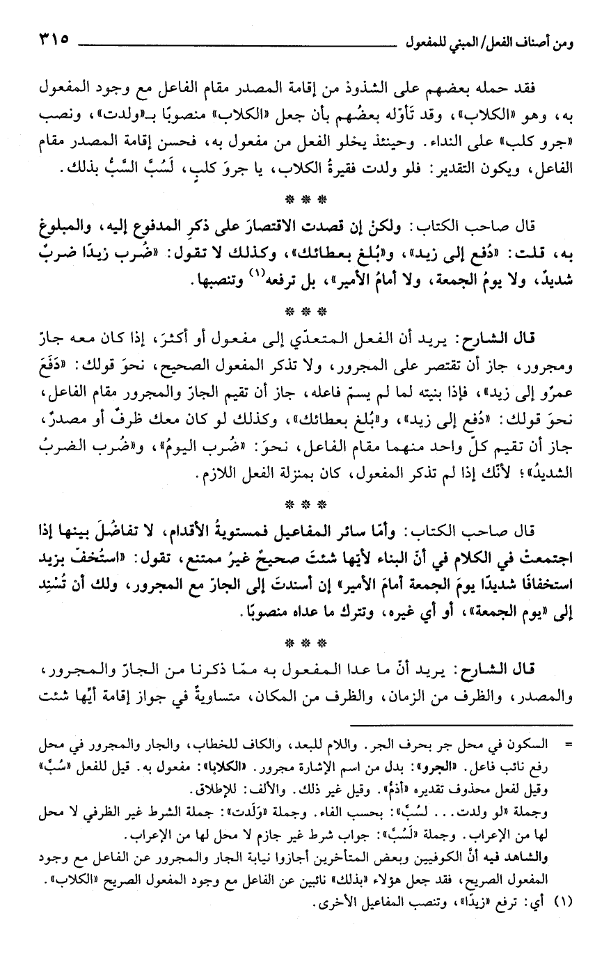 قال صاحب الكتاب: ولكن إن قصدت الاقتصار على ذكر المدفوع إليه, والمبلوغ به, قلت: "دُفع إلى زيد" و"بُلغ بعطائك"، وكذلك لا تقول: "ضُرب زيداً ضربٌ شديدٌ, ولا يوم الجمعة, ولا أمام الأمير", بل ترفعه (¬1) وتنصبها.