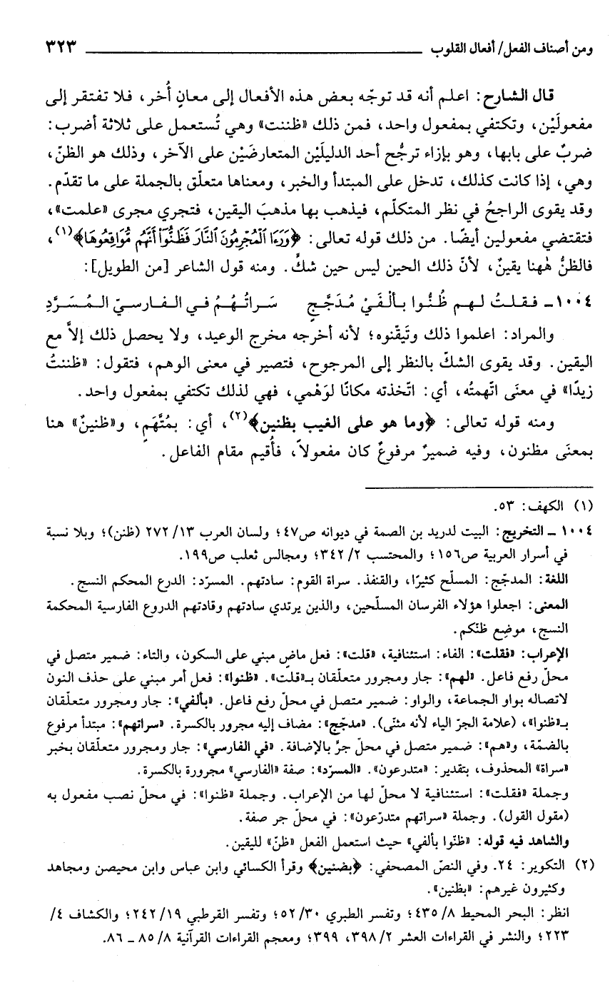 قال الشارح: اعلم أنه قد توجّه بعض هذه الأفعال إلى معانٍ أُخر، فلا تفتقر إلى مفعولَين، وتكتفى بمفعول واحد، فمن ذلك "ظننت" وهي تُستعمل على ثلاثة أضرب: ضربٌ على بابها، وهو بإزاء ترجح أحد الدليلَين المتعارضَيْنْ على الآخر، وذلك هو الظن، وهي، إذا كانت كذلك، تدخل على المبتدأ والخبر، ومعناها متعلق بالجملهْ على ما تقدم. وقد يقوى الراجحُ في نظر المتكلّم، فيذهب بها مذهبَ اليقين، فتجري مجرى "علمت"، فتقتضي مفعولين أيضًا. من ذلك قوله تعالى: {وَرَأَى الْمُجْرِمُونَ النَّارَ فَظَنُّوا أَنَّهُمْ مُوَاقِعُوهَا} (¬1)، فالظن ها هنا يقينٌ، لأن ذلك الحين ليس حين شك. ومنه قول الشاعر [من الطويل]: