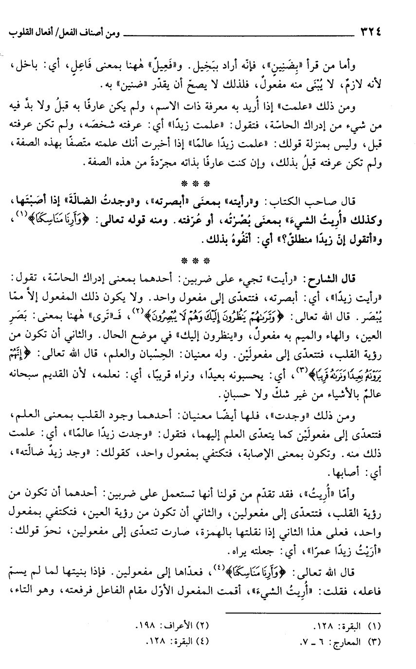 قال الشارح: رأيت" تجيء على ضربين: أحدهما بمعنى إدراك الحاسّة، تقول: "رأيت زيدًا"، أي: أبصرته، فتتعدّى إلى مفعول واحد. ولا يكون ذلك المفعول إلّا ممّا يُبْصَر. قال الله تعالى: {وَتَرَاهُمْ يَنْظُرُونَ إِلَيْكَ وَهُمْ لَا يُبْصِرُونَ} (¬2)، فَـ "تَرى" ها هنا بمعنى: بَصَرِ العين، والهاء والميم به مفعولٌ، و"ينظرون إليك" في موضع الحال. والثاني أن تكون من رؤية القلب، فتتعدّى إلى مفعولَين. وله معنيان: الحِسبان والعلم، قال الله تعالى: {إِنَّهُمْ يَرَوْنَهُ بَعِيدًا وَنَرَاهُ قَرِيبًا} (¬3)، أي: يحسبونه بعيدًا، ونراه قريبًا، أي: نعلمه، لأنّ القديم سبحانه عالم بالأشياء من غير شك ولا حسبان.