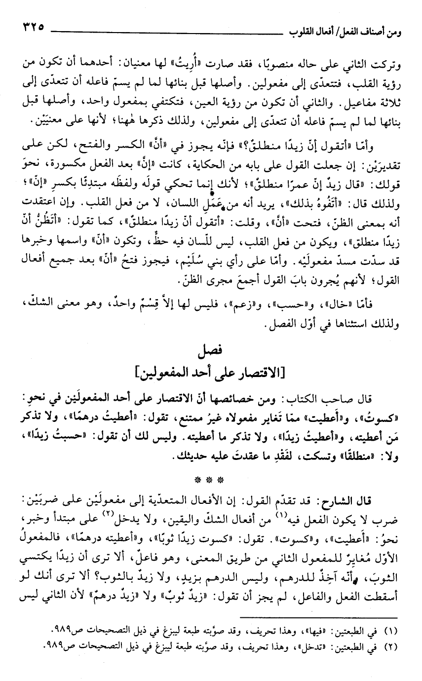 قال صاحب الكتاب: ومن خصائصها أن الاقتصار على أحد المفعولين في نحو: كسوت وأعطيت مما تغاير مفعولاه غير ممتنع, تقول أعطيت درهماً ولا تذكر من أعطيته، وأعطيت زيداً ولا تذكر ما أعطيته. وليس لك أن تقول حسبت زيداً ولا منطلقاً وتسكت، لفقد ما عقدت عليه حديثك.
