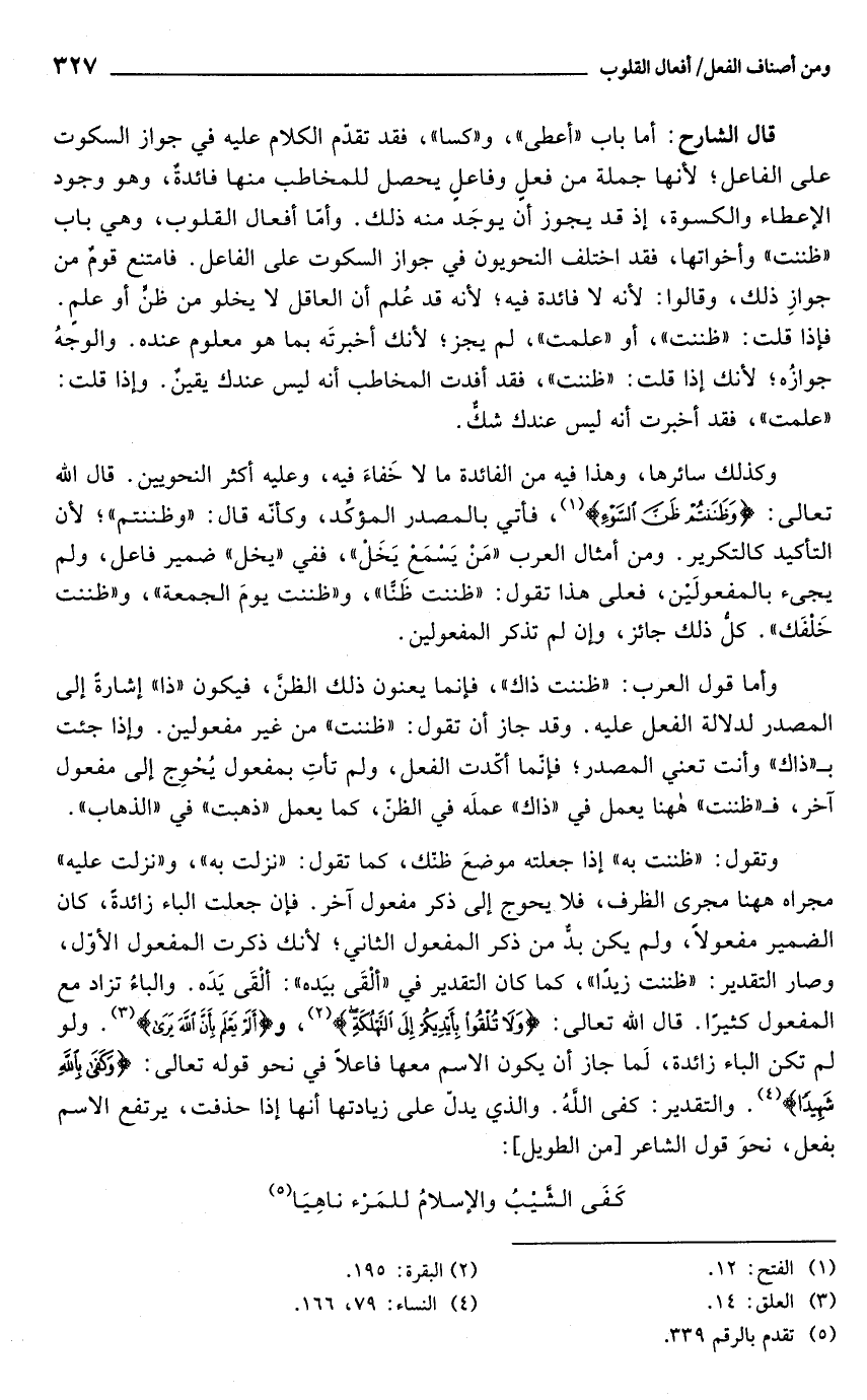 قال الشارح: أما باب "أعطى"، و"كسا"، فقد تقدّم الكلام عليه في جواز السكوت على الفاعل؛ لأنها جملة من فعل وفاعلٍ يحصل للمخاطب منها فائدةٌ، وهو وجود الإعطاء والكسوة، إذ قد يجوز أن يوجَد منه ذلك. وأمّا أفعال القلوب، وهي باب "ظننت" وأخواتها، فقد اختلف النحويون في جواز السكوت على الفاعل. فامتنع قومٌ من جوازِ ذلك، وقالوا: لأنه لا فائدة فيه؛ لأنه قد عُلم أن العاقل لا يخلو من ظن أو علم. فإذا قلت: "ظننت"، أو"علمت"، لم يجز؛ لأنك أخبرتَه بما هو معلوم عنده. والوجهُ جوازُه؛ لأنك إذا قلت: "ظننت"، فقد أفدت المخاطب أنه ليس عندك يقين. وإذا قلت: "علمت"، فقد أخبرت أنه ليس عندك شك.