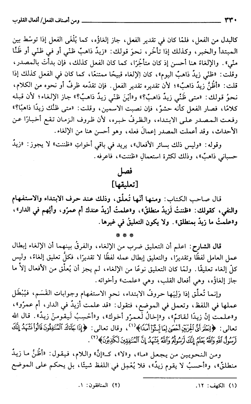 قال الشارح: اعلم أن التعليق ضرب من الإلغاء، والفرقُ بينهما أن الإلغاء إبطال عمل العامل لفظًا وتقديرًا، والتعليق إبطال عمله لفظًا لا تقديرًا، فكل تعليق إلغاءٌ، وليس كل إلغاء تعليقًا. ولمّا كان التعليق نوعًا من الإلغاء، لم يجز أن يُعلَّق من الأفعال إلَّا ما جاز إلغاؤُه، وهي أفعال القلب، وهي "علمت" وأخواته.