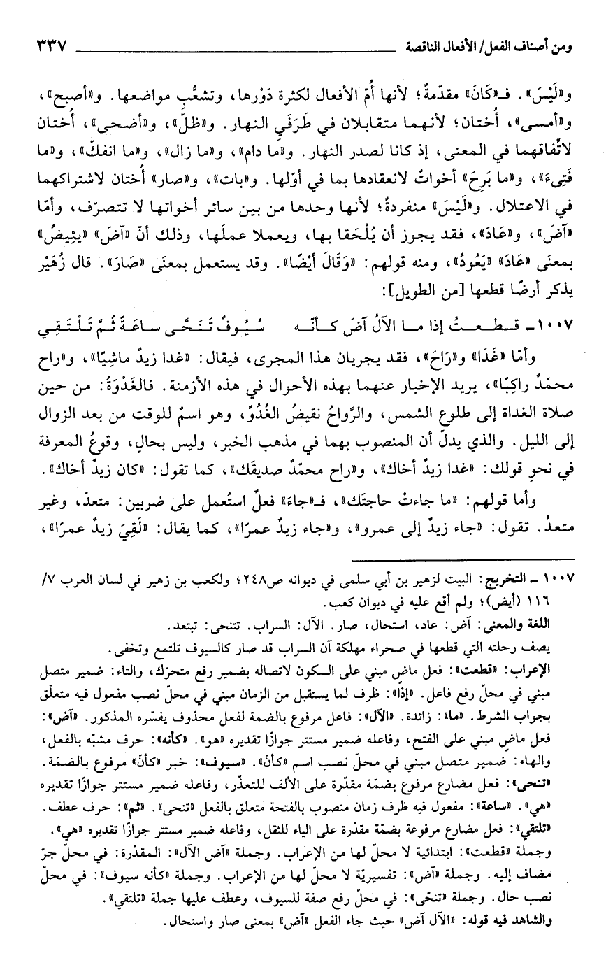 1007 - التخريج: البيت لزهير بن أبي سلمى في ديوانه ص 248؛ ولكعب بن زهير في لسان العرب 7/ 116 (أيض)؛ ولم أقع عليه في ديوان كعب.