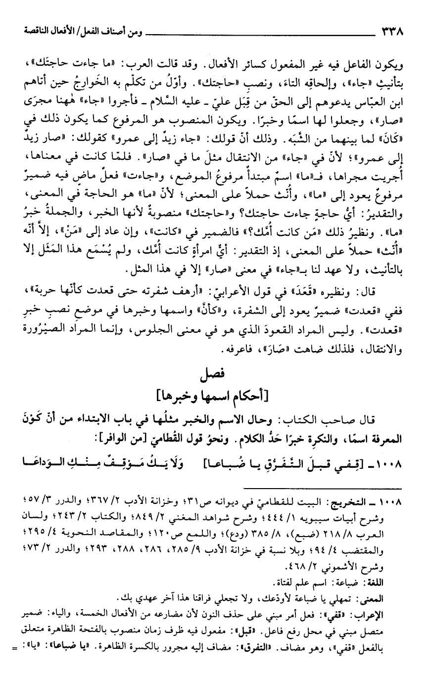 ويكون الفاعل فيه غير المفعول كسائر الأفعال. وقد قالت العرب:"ما جاءت حاجتَك"، بتأنيثِ "جاء"، وإلحاقِه التاءَ، ونصب "حاجتك". وأوّلُ من تكلّم به الخَوارجُ حين أتاهم ابن العبّاس يدعوهم إلى الحقّ من قَبَل عليّ -عليه السّلام- فأجروا "جاء" ها هنا مجرَى "صار"، وجعلوا لها اسمًا وخبرًا. ويكون المنصوب هو المرفوع كما يكون ذلك في "كَانَ" لما بينهما من الشّبَه. وذلك أن قولك: "جاء زيد إلى عمرو" كقولك: "صار زيدٌ إلى عمرو"؛ لأنّ في "جاء" من الانتقال مثلَ ما في "صار". فلمّا كانت في معناها، أُجريت مجراها، فـ"ما" اسم مبتدأٌ مرفوعُ الموضع، و"جاءت" فعلٌ ماضٍ فيه ضميرٌ مرفوعٌ يعود إلى "ما"، وأُنّث حملًا على المعنى؛ لأنّ "ما" هو الحاجة في المعنى، والتقديرُ: أيُ حاجةٍ جاءت حاجتك؟ و"حاجتك" منصوبة لأنها الخبر، والجملةُ خبرُ "ما". ونظيرُ ذلك "مَن كانت أُمَّك؟ " فالضمير في "كانت"، وإن عاد إلى "مَنْ"، إلَّا أنّه "أُنّث" حملًا على المعنى، إذ التقدير: أيّ امرأةٍ كانت أُمّك، ولم يُسْمَع هذا المَثَل إلا بالتأنيث، ولا عهد لنا بـ "جاء" في معنى "صار" إلا في هذا المثل.
