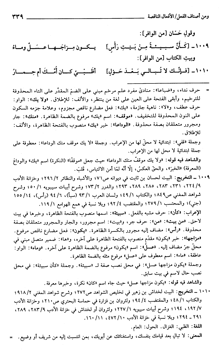 1009 - التخريج: البيت لحسان بن ثابت في ديوانه ص 71؛ والأشباه والنظائر 2/ 296؛ وخزانة الأدب 9/ 224، 231، 283، 285، 289، 293؛ والدرر 2/ 73؛ وشرح أبيات سيبوبه 1/ 50؛ وشرح شواهد المغني ص 849؛ والكتاب 1/ 49؛ ولسان العرب 1/ 93 (سبأ)، 6/ 94 (رأس)، 14/ 155 (جني)؛ والمحتسب 1/ 279؛ والمقتضب 4/ 92؛ وبلا نسبة في همع الهوامع 1/ 119.