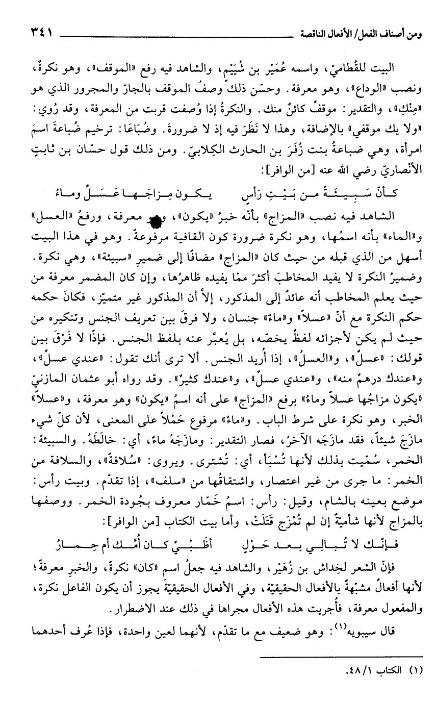 الشاهد فيه نصب "المزاج" بأنّه خبرُ "يكون"، وهو معرفة، ورفعُ "العسل" و"الماء" بأنه اسمُها، وهو نكرة ضرورة كون القافية مرفوعةً. وهو في هذا البيت أسهل من الذي قبله من حيث كان "المزاج" مضافًا إلى ضميرِ "سبيئة"، وهي نكرة. وضميرُ النكرة لا يفيد المخاطبَ أكثرَ ممّا يفيده ظاهرُها، وإن كان المضمر معرفة من حيث يعلم المخاطب أنه عائدٌ إلى المذكور، إلا أن المذكور غير متميّز، فكانَ حكمه حكم النكرة مع أنّ "عسلًا" و"ماءً" جنسان، ولا فرقَ بين تعريف الجنس وتنكيره من حيث لم يكن لأجزائه لفظٌ يخصّه، بل يُعبَّر عنه بلفظ الجنس. فإذًا لا فَرْقَ بين قولك: "عسلٌ"، و"العسلُ"، إذا أُريد الجنس. ألا ترى أنك تقول: "عندي عسلٌ"، و"عندك درهمٌ منه"، و"عندي عسلٌ"، و"عندك كثيرٌ". وقد رواه أبو عثمان المازنيّ "يكون مزاجُها عسلًا وماءُ" برفع "المزاج" على أنه اسمُ "يكون" وهو معرفة، و"عسلًا" الخبر، وهو نكرة على شرط الباب. و"ماءٌ" مرفوع حَمْلًا على المعنى, لأنّ كلّ شيء مازَجَ شيئًا، فقد مازَجَه الآخرُ، فصار التقدير: ومازَجَهُ ماءٌ، أي: خالَطَهُ. والسبيئة: الخمر، سُمّيت بذلك لأنها تُسْبأ، أي: تُشترى. ويروى: "سُلافةً"، والسلافة من الخمر: ما جرى من غير اعتصار، واشتقاقُها من "سلف"، إذا تقدّم. وبيت رأس: موضع بعينه بالشام، وقيل: رأس: اسمُ خَمّار معروف بجُودة الخمر. ووصفها بالمزاج لأنها شأميّةٌ إن لم تُمْزَج قَتَلَتْ، وأما بيت الكتاب [من الوافر]: