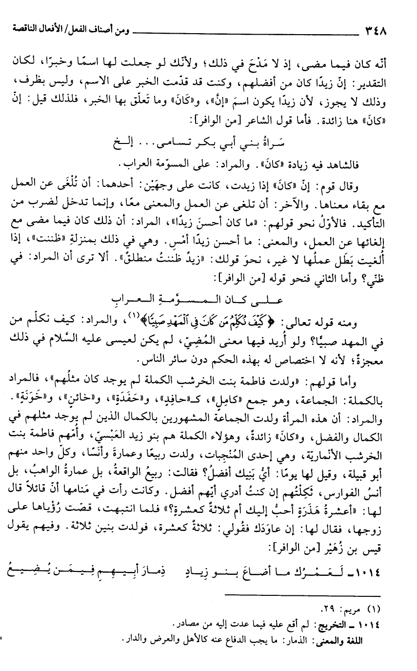 وأما قولهم: "ولدت فاطمة بنت الخرشب الكملة لم يوجد كان مثلُهم"، فالمراد بالكملة: الجماعة، وهو جمع "كامِلٍ"، كـ"حافِدٍ"، و"حَفَدَةٍ"، و"خائنٍ"، و"خَوَنَةٍ". والمراد: أن هذه المرأة ولدت الجماعة المشهورين بالكمال الذين لم يوجد مثلهم في الكمال والفضل، و"كانَ" زائدةٌ، وهؤلاء الكملة هم بنو زيد العَبْسيّ، وأُمّهم فاطمة بنت الخرشب الأنْماريّة، وهي إحدى المُنْجِبات، ولدت ربيعًا وعمارةَ وأنَسًا، وكل واحد منهم أبو قبيلة، وقيل لها يومًا: أيُّ بَنِيك أفضلُ؟ فقالت: ربيعُ الواقعةُ، بل عمارةُ الواهبُ، بل أنسُ الفوارس، ثَكِلتُهم إن كنتُ أدري أيّهم أفضل. وكانت رأت في مَنامها أن قائلًا قال لها: "أعشرةُ هَذَرَةٍ أحبُّ إليك أم ثلاثة كعشرةٍ؟ " فلما انتبهت، قصّت رُؤْياها على زوجها، فقال لها: إن عاوَدَك فقُولي: ثلاثةٌ كعشرة، فولدت بنين ثلاثة. وفيهم يقول قيس بن زُهَير [من الوافر]: