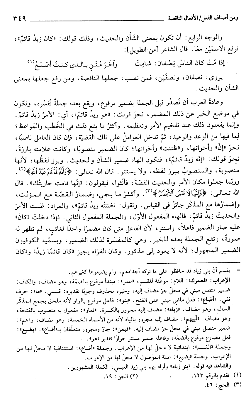 والوجه الرابع: أن تكون بمعنى الشَأْن والحديثِ، وذلك قولك: "كان زيدٌ قائمٌ"، ترفع الاسمَيْن معًا. قال الشاعر [من الطويل]: