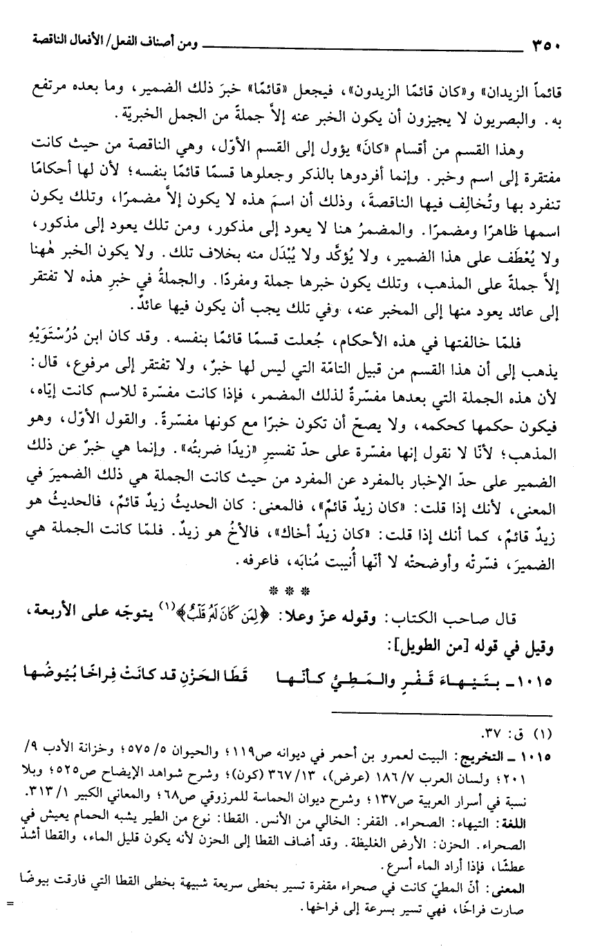 قال صاحب الكتاب: وقوله عز وجل: {لمن كان له قلب} (¬1) يتوجه على الأربعة, وقيل في قوله [من الطويل]: