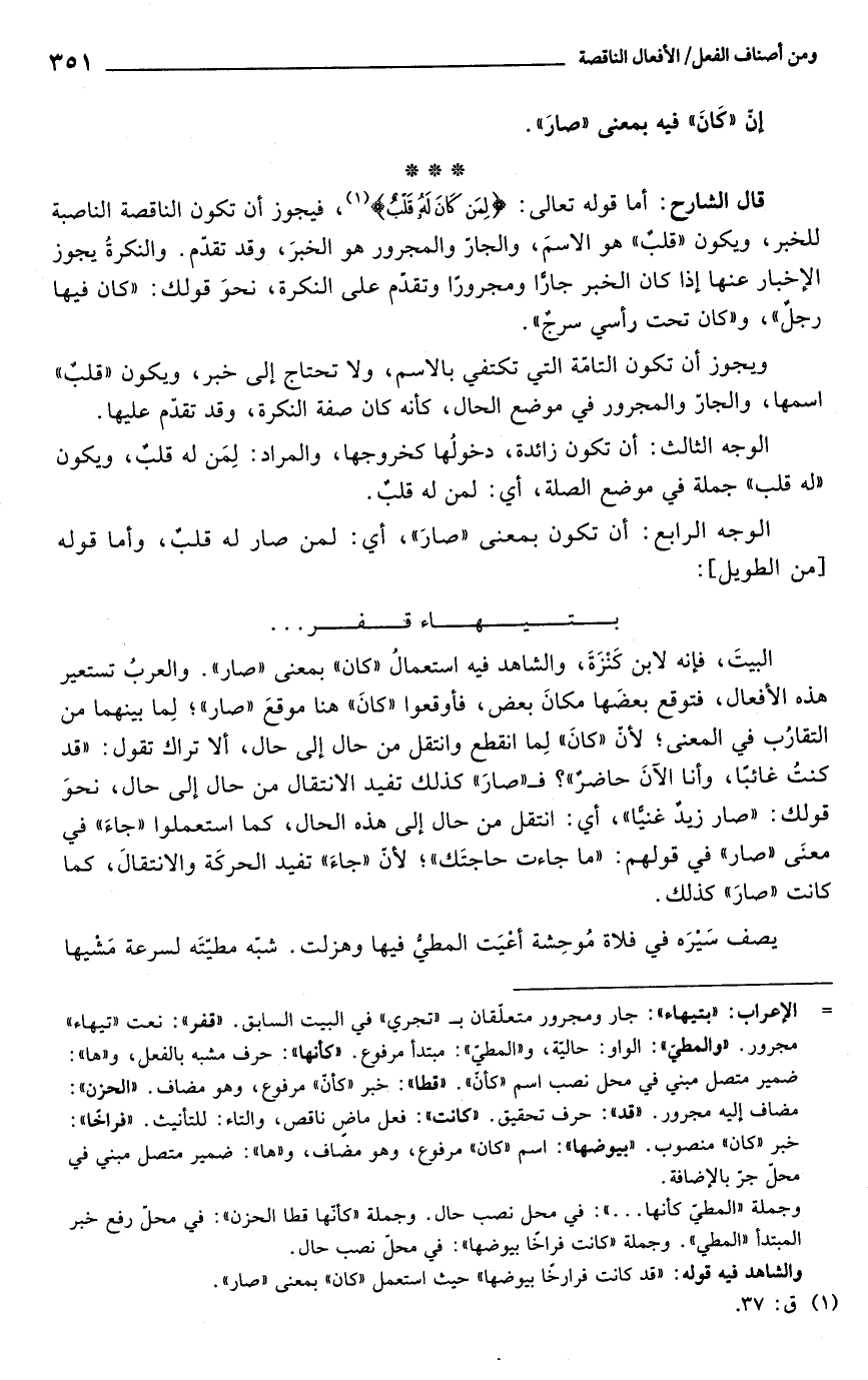 قال الشارح: أما قوله تعالى: {لِمَنْ كَانَ لَهُ قَلْبٌ} (¬1)، فيجوز أن تكون الناقصة الناصبة للخبر، ويكون "قلبٌ" هو الاسمَ، والجارّ والمجرور هو الخبرَ، وقد تقدّم. والنكرةُ يجوز الإخبار عنها إذا كان الخبر جارًا ومجرورًا وتقدّم على النكرة، نحوَ قولك: "كان فيها رجلٌ"، و"كان تحت رأسي سرجٌ".