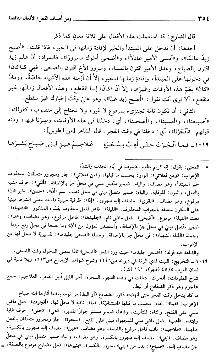 الثاني: أن تكون تامّة تجتزىء بمرفوع لا غير، ولا تحتاج إلى منصوب، كقولك: "أصبحنا"، و"أمسينا"، و"أضحينا"، أي: دخلنا في هذه الأوقات، وصِرْنا فيها، ومنه قولهم: "أفْجَرْنا"، أي: دخلنا في وقت الفجر. قال الشاعر [من الطويل]: