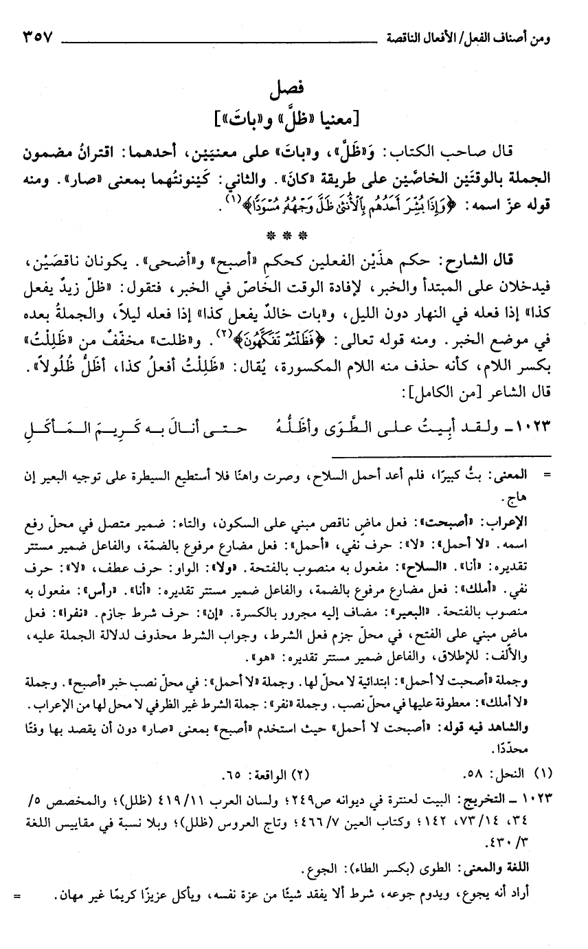 قال صاحب الكتاب: و"ظل", و"بات" على معنيين, أحدهما: اقتران مضمون الجملة بالوقتين الخاصين على طريقة "كان". والثاني: كينونتهما بمعنى "صار". ومنه قوله تعالى: {وإذا بشر أحدهم بالأنثى ظل وجهه مسوداً} (¬1).