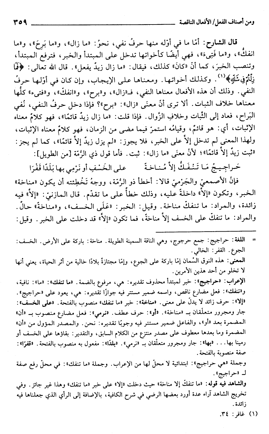 قال الشارح: أمّا ما في أوّله منها حرفُ نفي، نحوُ: "ما زال"، و"ما بَرِحَ"، و"ما انفكُّ"، و"ما فَتِىءَ"، فهي أيضًا كأخواتها تدخل على المبتدا والخبر، فترفع المبتدأ، وتنصب الخبرَ، كما أنّ "كانَ" كذلك، فيقال: "ما زال زيدٌ يفعل". قال الله تعالى: {فَمَا زِلْتُمْ فِي شَكٍّ} (¬1). وكذلك أخواتها. ومعناها على الإيجاب، وإن كان في أوّلها حرفُ النفي. وذلك أن هذه الأفعال معناها النفي، فـ "زال"، و"برح"، و"انفكّ"، و"فتىء" كلُها معناها خلاف الثبات. ألا ترى أن معنَى "زال": "برح"؟ فإذا دخل حرفُ النفي، نُفي البَراح، فعاد إلى الثبات وخلافِ الزَّوال. فإذا قلت: "ما زال زيدٌ قائمًا"، فهو كلامٌ معناه الإثبات، أي: هو قائمٌ، وقيامُه استمرّ فيما مضى من الزمان، فهو كلامٌ معناه الإثبات، ولهذا المعني لم تدخل إلّا على الخبر، فلا يجوز: "لم يزل زيد إلّا قائمًا"، كما لم يجز: "ثبت زيدٌ إلّا قائمًا"؛ لأنّ معنَى "ما زال": ثبت. فأما قول ذي الرُّمّة [من الطويل]: