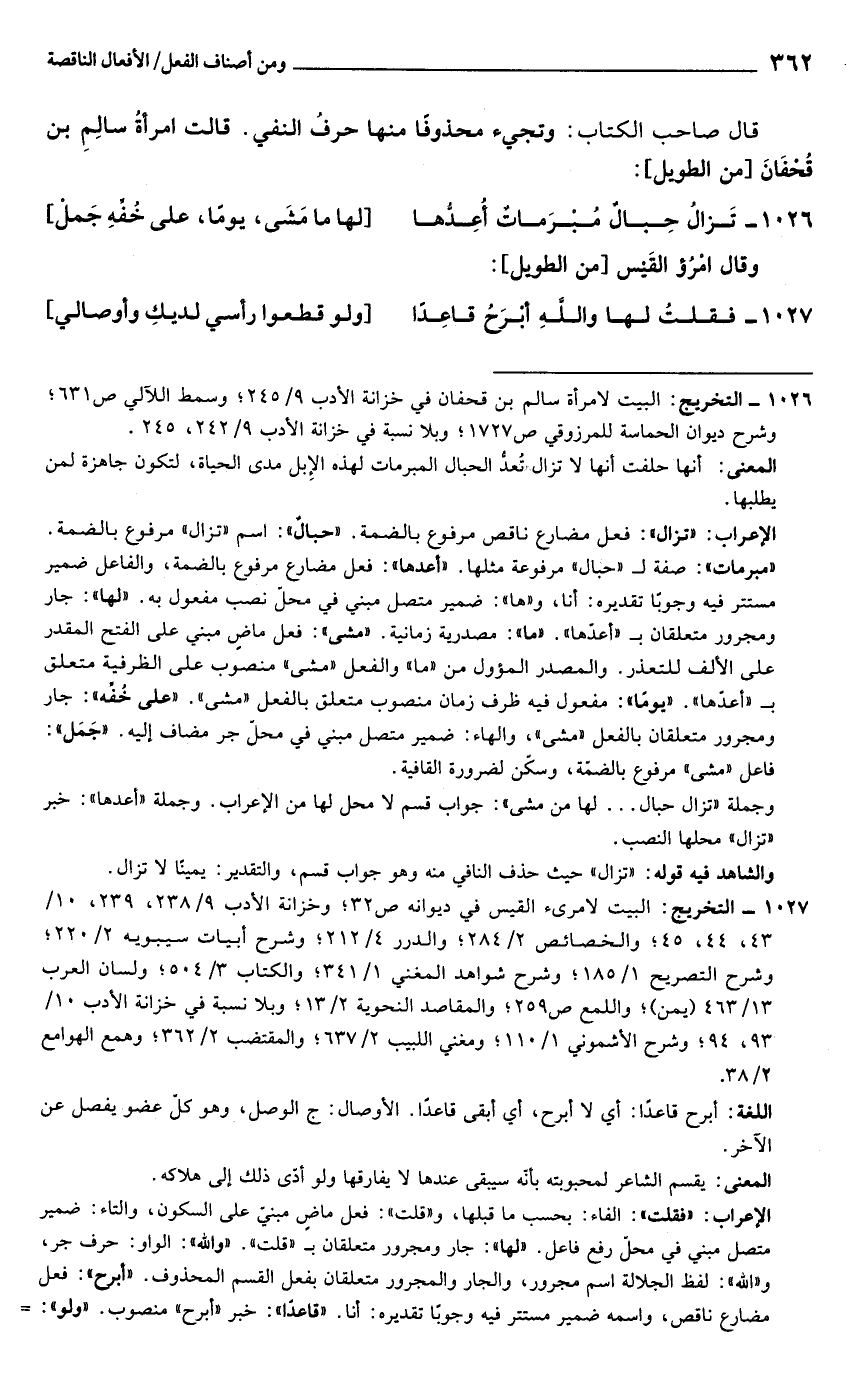 الإعراب: "تزال": فعل مضارع ناقص مرفوع بالضمة. "حبالٌ": اسم "تزال" مرفوع بالضمة. "مبرمات": صفة لـ"حبال" مرفوعة مثلها. "أعدها": فعل مضارع مرفوع بالضمة، والفاعل ضمير مستتر فيه وجوبًا تقديره: أنا، و"ها": ضمير متصل مبني في محلّ نصب مفعول به. "لها": جارّ ومجرور متعلقان بـ"أعدّها". "ما": مصدرية زمانية. "مشى": فعل ماضٍ مبني على الفتح المقدر على الألف للتعذر. والمصدر المؤول من "ما" والفعل "مشى" منصوب على الظرفية متعلق بـ"أعدّها"."يومًا": مفعول فيه ظرف زمان منصوب متعلق بالفعل "مشى". "على خُفّه": جارّ ومجرور متعلقان بالفعل "مشى"، والهاء: ضمير متصل مبني في محلّ جر مضاف إليه. "جَمَل": فاعل "مشى" مرفوع بالضمّة، وسكن لضرورة القافية.