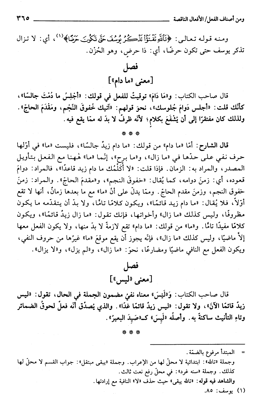 قال الشارح: أمّا "ما دام" من قولك: "ما دام زيدٌ جالسًا"، فليست "ما" في أوّلها حرف نفي على حدّها في "ما زال"، و"ما برح"، إنّما "ما" ها هنا مع الفعل بتأويل المصدر، والمراد به: الزمان. فإذا قلت: "لا أُكَلمُك ما دام زيد قاعدًا"، فالمراد: دوامَ قعوده، أي: زمنَ دوامه، كما يُقال: "خفوقَ النجم"، و"مقدمَ الحاجّ". والمراد: زمنَ خفوق النجم، وزمنَ مقدم الحاجّ. وممّا يدلّ على أن "ما" مع ما بعدها زمانٌ، أنها لا تقع أوّلًا، فلا يُقال: "ما دام زيد قائمًا"، ويكون كلامًا تامًّا، ولا بد أن يتقدّمه ما يكون مظروفًا، وليس كذلك "ما زال" وأخواتها، فإنك تقول: "ما زال زيدٌ قائمًا"، ويكون كلامًا مفيدًا تامًّا. و"ما" من قولك: "ما دام" تقع لازمةٌ لا بد منها، ولا يكون الفعل معها إلّا ماضيًا، وليس كذلك "ما زال"، فإنّه يجوز أن يقع موقعَ "ما" غيرُها من حروف النفي، ويكون الفعل مع النافي ماضيًا ومضارعًا، نحوَ: "ما زال"، و"لم يزل"، و"لا يزال".