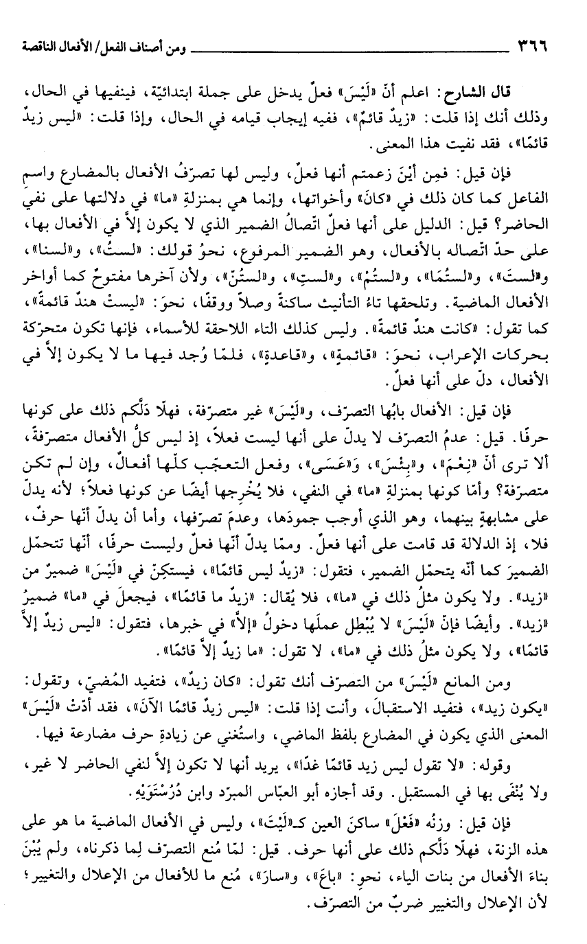 قال الشارح: اعلم أنّ "لَيْسَ" فعلٌ يدخل على جملة ابتدائية، فينفيها في الحال، وذلك أنك إذا قلت: "زيد قائمٌ"، ففيه إيجاب قيامه في الحال، وإذا قلت: "ليس زيدٌ قائمًا"، فقد نفيت هذا المعنى.