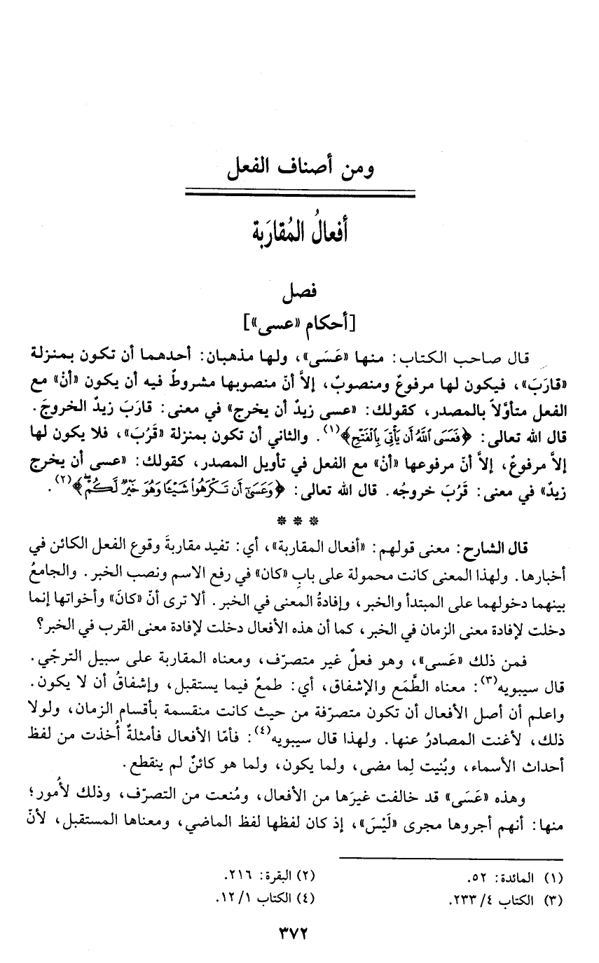 فمن ذلك "عَسى"، وهو فعل غير متصرّف، ومعناه المقاربة على سبيل الترجّي. قال سيبويه (¬3): معناه الطمَع والإشفاق، أي: طمعٌ فيما يستقبل، وإشفاقُ أن لا يكون. واعلم أن أصل الأفعال أن تكون متصرّفة من حيث كانت منقسمة بأقسام الزمان، ولولا ذلك، لأغنت المصادرُ عنها. ولهذا قال سيبويه (¬4): فأمّا الأفعال فأمثلة أُخذت من لفظ أحداث الأسماء، وبُنيت لِما مضى، ولما يكون، ولما هو كائن لم ينقطع.