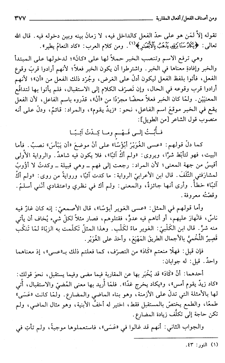كما دلّ قولهم: "عسى الغُوَيْرُ أبُؤُسًا" على أنّ موضعَ "أن يَبْأسَ" نصبٌ. فأما البيت، فهو لتأبّط شرًّا، ويروى: "ولم أكُ آئبًا"، فلا يكون فيه شاهدٌ. والرواية الأوُلى أقيسُ من جهة المعنى؛ لأنّ المراد: رجعت إلى فهم- وهي قبيلة- وكدتُ لا أؤُوبُ لمشارَفتي التَّلَفَ. قال ابن الأعرابىّ الرواية: ما كدت آئبًا، وروايةُ من روى: "ولم أكُ آئبًا" خطأ. وأرى أنها جائزةٌ، والمعنى: ولم أك في نظري واعتقادي أنّنى أسلمُ. وقصّته معروفة.