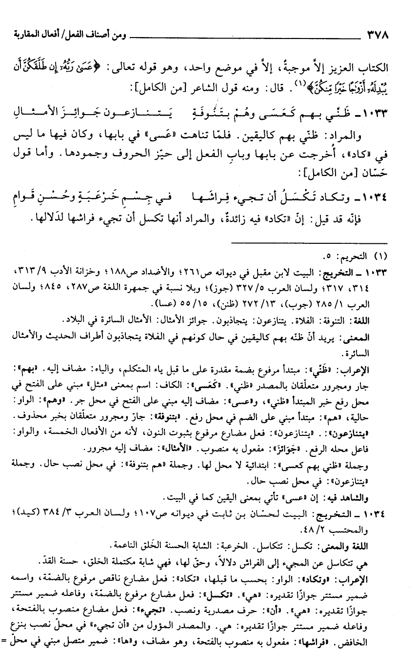 والمراد: ظنّي بهم كاليقين. فلمّا تناهت "عَسى" في بابها، وكان فيها ما ليس في "كاد"، أخرجت عن بابها وبابِ الفعل إلى حيّز الحروف وجمودها. وأما قول حسان [من الكامل]: