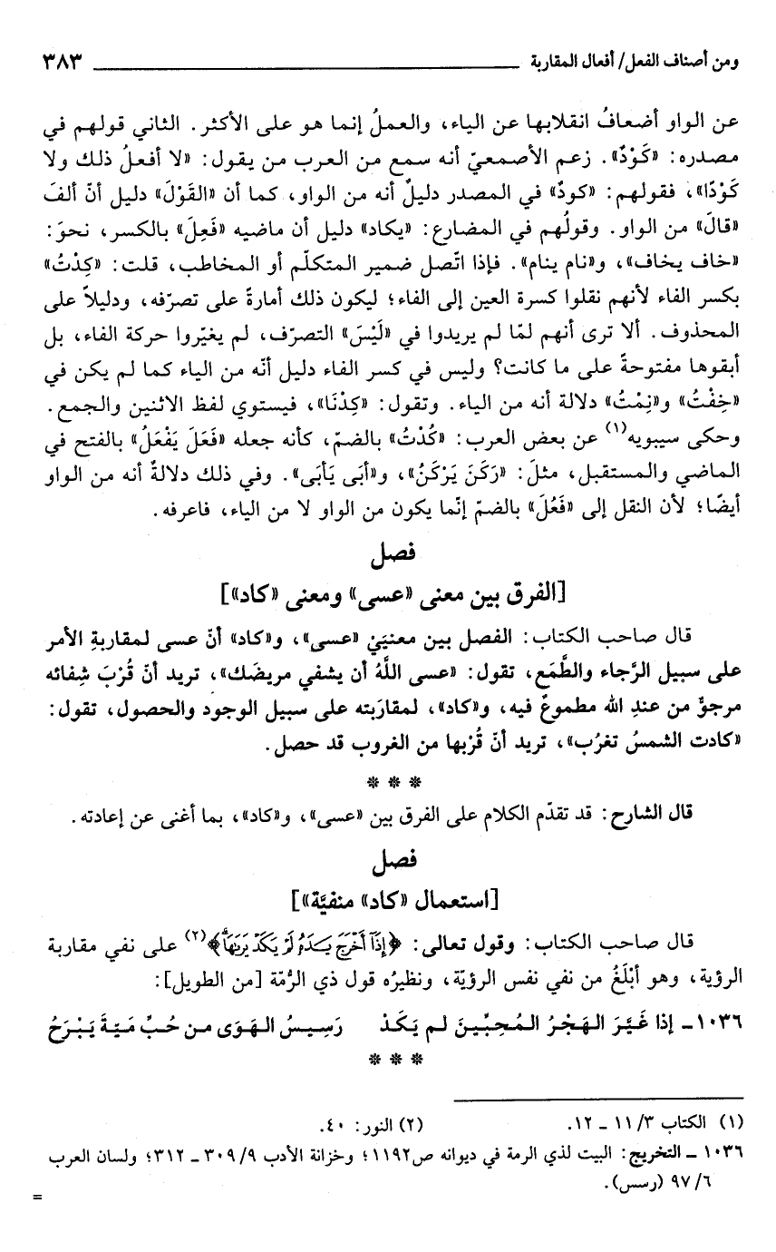 قال صاحب الكتاب: والفصل بين معنيي "عسى", و"كاد" أن عسى لمقاربة الأمر على سبيل الرجاء والطمع، تقول: "عسى الله أن يشفي مريضك"، تريد أن قرب شفائه مرجو من عند الله تعالى مطموع فيه, و"كاد", لمقاربته على سبيل الوجود والحصول، تقول:"كادت الشمس تغرب"، تريد أن قربها من الغروب قد حصل.