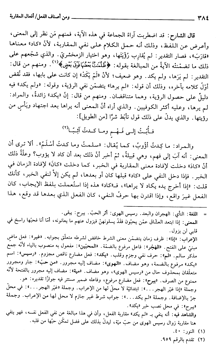 قال الشارح: قد اضطربت آراءُ الجماعة في هذه الآية، فمنهم مَن نظر إلى المعنى، وأعرض عن اللفظ، وذلك أنه حمل الكلام على نفي المقاربة, لأنّ "كاد" معناها "قارَبَ"، فصار التقدير: لم يُقارِب رُؤْيَتَها، وهو اختيار الزمخشريّ. والذي شجّعهم على ذلك ما تضمّنته الآيةُ من المبالغة بقوله: {ظُلُمَاتٌ بَعْضُهَا فَوْقَ بَعْضٍ} (¬1). ومنهم من قال: التقدير: لم يَرَها، ولم يكد. وهو ضعيف؛ لأنّ "لَمْ يَكَدْ" إن كانت على بابها، فقد نُقض أوّلُ كلامه بآخره، وذلك أن قوله: "لم يرها" يتضمّن نفي الرؤية، وقوله: "ولم يكد" فيه دليلٌ على حصول الرؤية، وهما متناقضان. ومنهم من قال: إنّ "يكد" زائدةٌ، والمراد: لم يرها، وعليه أكثر الكوفيين. والذي أراه أنّ المعنى أنه يراها بعد اجتهاد ويَأسٍ من رؤيتها. والذي يدلّ على ذلك قول تأبّط شرًا [من الطويل]: