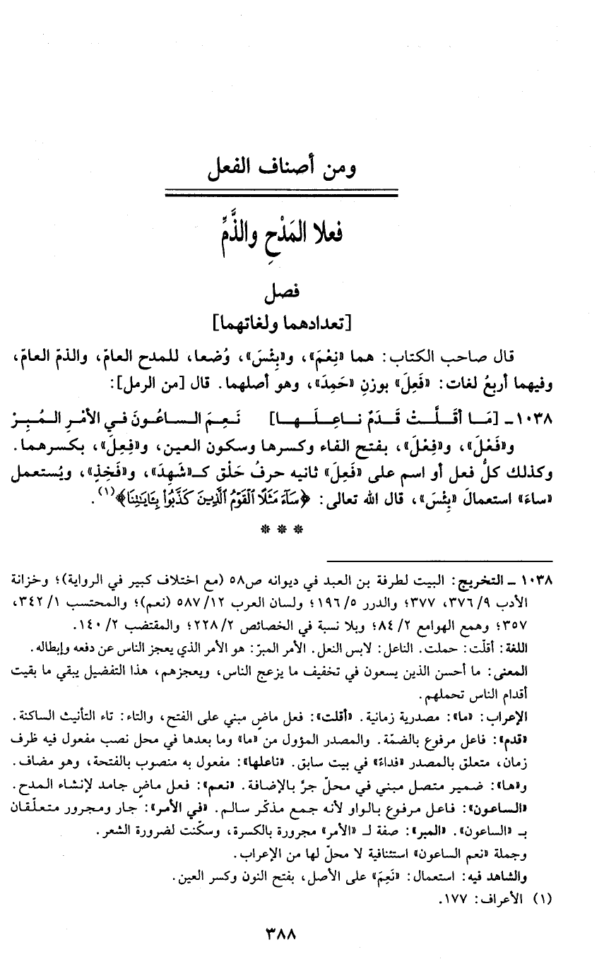 قال صاحب الكتاب: هما نعم وبئس، وُضعا, للمدح العام والذم العام، وفيهما أربع لغات: فعل بوزن حمد وهو أصلهما قال [من الرمل]: