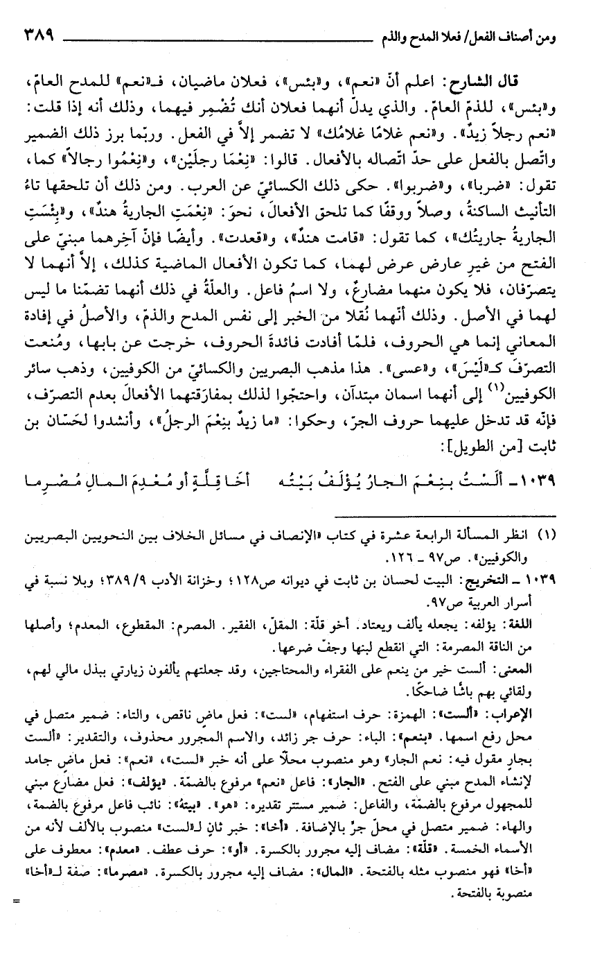 قال الشارح: اعلم أنّ "نعم"، و"بئس"، فعلان ماضيان، فـ "نعم" للمدح العامّ، و"بئس"، للذم العام. والذي يدلّ أنهما فعلان أنك تُضمِر فيهما، وذلك أنه إذا قلت: "نعم رجلًا زيدٌ". و"نعم غلامًا غلامُك" لا تضمر إلّا في الفعل. وربّما برز ذلك الضمير واتصل بالفعل على حدّ اتصاله بالأفعال. قالوا: "نِعْما رجلَيْن"، و"نِعْمُوا رجالاً" كما، تقول: "ضربا"، و"ضربوا". حكى ذلك الكسائيّ عن العرب. ومن ذلك أن تلحقها تاءُ التأنيث الساكنةُ، وصلاً ووقفًا كما تلحق الأفعالَ، نحوَ: "نِعْمَتِ الجاريةُ هندٌ"، و"بِئْسَتِ الجاريةُ جاريتُك"، كما تقول: "قامت هندٌ"، و"قعدت". وأيضًا فإنّ آخِرهما مبنيّ على الفتح من غيرِ عارض عرض لهما، كما تكون الأفعال الماضية كذلك، إلّا أنهما لا يتصرّفان، فلا يكون منهما مضارع، ولا اسمُ فاعل. والعلّةُ في ذلك أنهما تضمّنا ما ليس لهما في الأصل. وذلك أنهما نُقلا من الخبر إلى نفس المدح والذمّ، والأصل في إفادة المعاني إنما هي الحروف، فلمّا أفادت فائدةَ الحروف، خرجت عن بابها، ومُنعت التصرّفَ كـ"لَيسَ"، و"عسى". هذا مذهب البصريين والكسائي من الكوفيين، وذهب سائر الكوفيين (¬1) إلى أنهما اسمان مبتدآن، واحتجّوا لذلك بمفارَقتهما الأفعالَ بعدم التصرّف، فإنّه قد تدخل عليهما حروف الجرّ، وحكوا: "ما زيد بنِعمَ الرجلُ"، وأنشدوا لحَسان بن ثابت [من الطويل]: