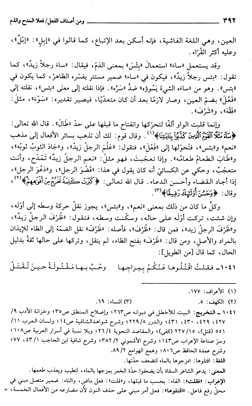 وإنما قلبت الواو ألفًا لتحرّكها وانفتاح ما قبلها على حدّ "طال". قال الله تعالى: {سَاءَ مَثَلًا الْقَوْمُ الَّذِينَ كَذَّبُوا بِآيَاتِنَا} (¬1). وقال قوم: لك أن تذهب بسائر الأفعال إلى مذهب "نعم" و"بئس"، فتُحوّلها إلى "فَعُلَ"، فتقول: "عَلُمَ الرجلُ زيدٌ"، و"جادَ الثوبُ ثوبُه"، و"طَابَ الطعامُ طعامُه". وإذا تعجّبتَ، فهو مثلُ: "نعم الرجلُ زيدٌ" تَمْدَح، وأنت متعجّبٌ، وحكي عن الكسائيّ أنه كان يقول في هذا: "قَضُوَ الرجل"، و"دَعُوَ الرجل"، إذا أجاد القضاء وأحسن الدعاء. قال الله تعالى: {كَبُرَتْ كَلِمَةً تَخْرُجُ مِنْ أَفْوَاهِهِمْ} (¬2)، وقال: {وَحَسُنَ أُولَئِكَ رَفِيقًا} (¬3).