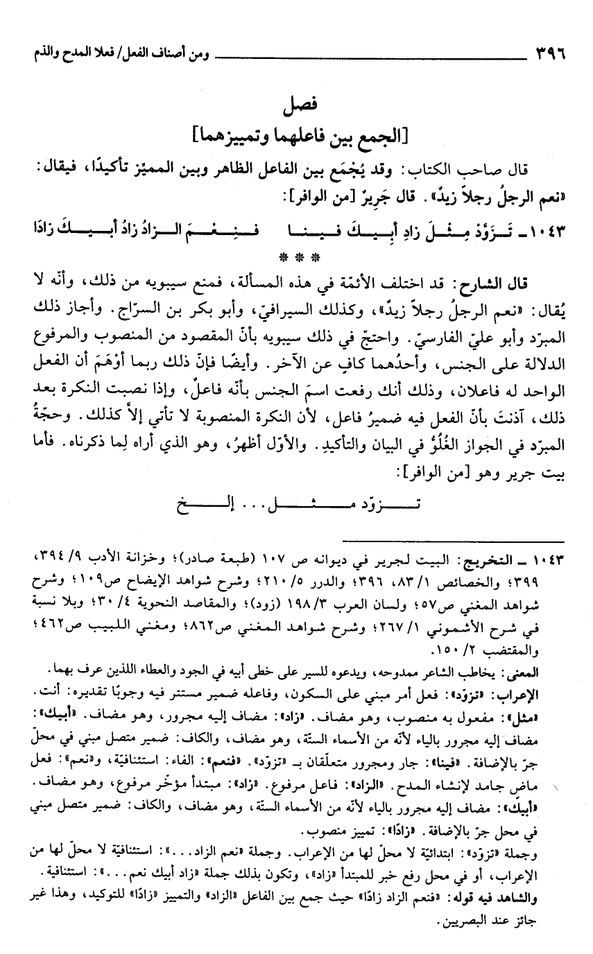 قال الشارح: قد اختلف الأئمّة في هذه المسألة، فمنع سيبويه من ذلك، وأنّه لا يُقال: "نعم الرجلُ رجلًا زيدٌ"، وكذلك السيرافيّ، وأبو بكر بن السرّاج. وأجاز ذلك المبرّد وأبو علي الفارسيّ. واحتجّ في ذلك سيبويه بأن المقصود من المنصوب والمرفوع الدلالة على الجنس، وأحدُهما كافٍ عن الآخر. وأيضًا فإنّ ذلك ربما أوْهَمَ أن الفعل الواحد له فاعلان، وذلك أنك رفعت اسمَ الجنس بأنّه فاعلٌ، وإذا نصبت النكرة بعد ذلك، آذنتَ بأنّ الفعل فيه ضميرُ فاعل, لأنّ النكرة المنصوبة لا تأتي إلّا كذلك. وحجّةُ المبرّد في الجواز الغُلُوُّ في البيان والتأكيدِ. والأوّل أظهرُ، وهو الذي أراه لِما ذكرناه. فأما بيت جرير وهو [من الوافر]: