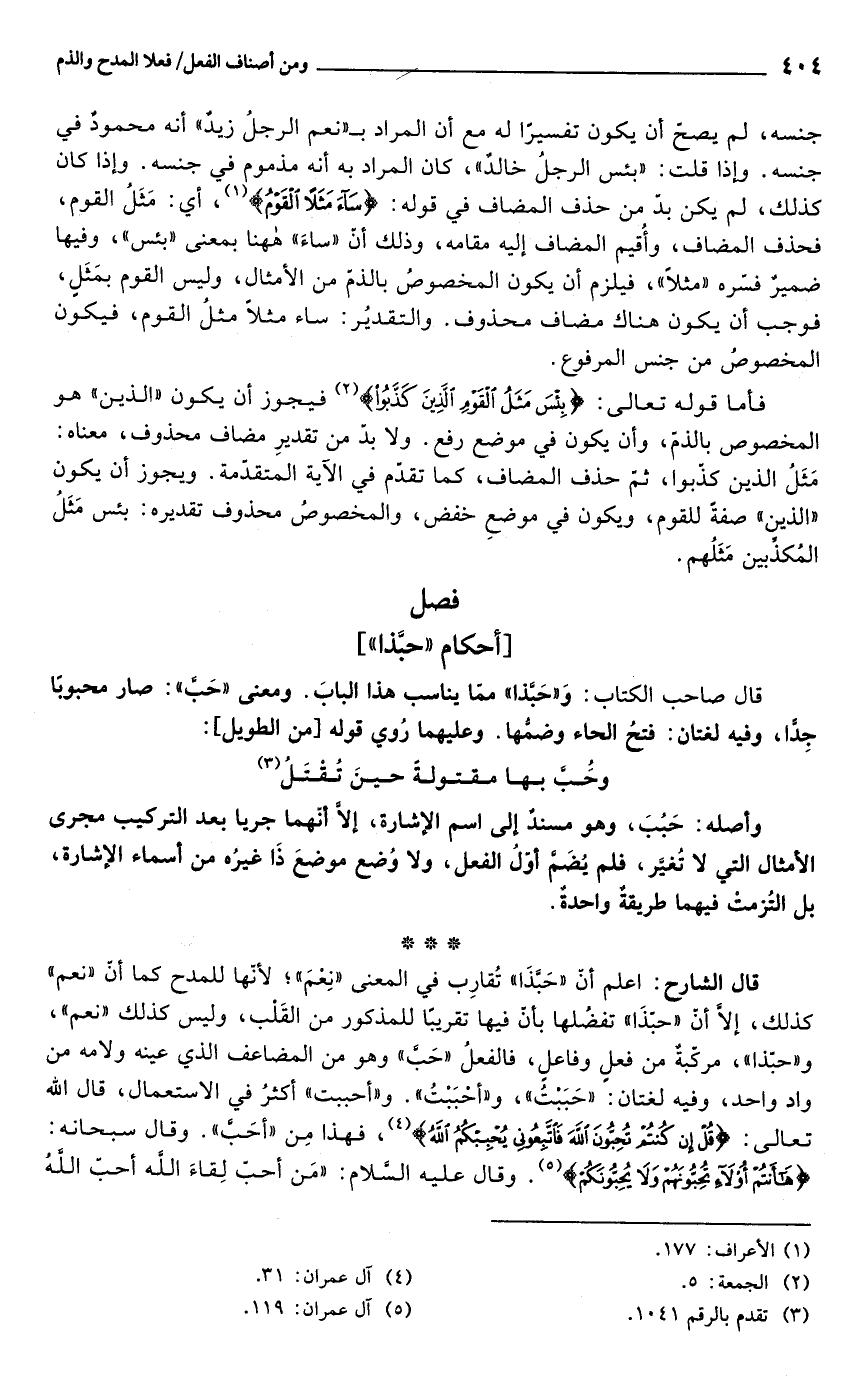 قال الشارح: اعلم أن "حَبَّذَا" تُقارِب في المعنى "نِعْمَ"؛ لأنها للمدح كما أن "نعم" كذلك، إلَّا أنَّ "حبّذَا" تفضُلها بأنّ فيها تقريبًا للمذكور من القَلْب، وليس كذلك "نعم"، و"حبّذا"، مركّبةٌ من فعلٍ وفاعلٍ، فالفعلُ "حَبَّ" وهو من المضاعف الذي عينه ولامه من واد واحد، وفيه لغتان: "حَبَبْتُ"، و"أحْبَبْتُ". و"أحببت" أكثرُ في الاستعمال، قال الله تعالى: {قُلْ إِنْ كُنْتُمْ تُحِبُّونَ اللَّهَ فَاتَّبِعُونِي يُحْبِبْكُمُ اللَّهُ} (¬4)، فهذا مِن "أحَبَّ". وقال سبحانه: {هَا أَنْتُمْ أُولَاءِ تُحِبُّونَهُمْ وَلَا يُحِبُّونَكُمْ} (¬5). وقال عليه السلام: "مَن أحبّ لِقاءَ الله أحبّ اللهُ