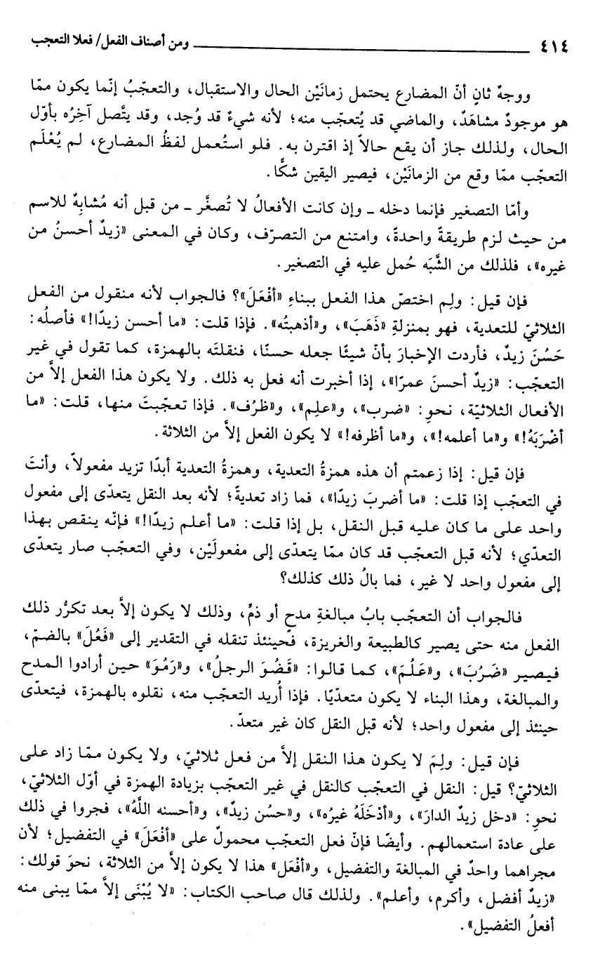 ووجة ثانٍ أن المضارع يحتمل زمانَيْن الحال والاستقبال، والتعجّبُ إنما يكون ممّا هو موجودٌ مشاهَدٌ، والماضي قد يُتعجّب منه؛ لأنه شيءٌ قد وُجد، وقد يتَّصل آخِرُه بأوّل الحال، ولذلك جاز أن يقع حالًا إذ اقترن به. فلو استُعمل لفظُ المضارع، لم يُعْلَم التعجّب ممّا وقع من الزمانَيْن، فيصير اليقين شكًّا.