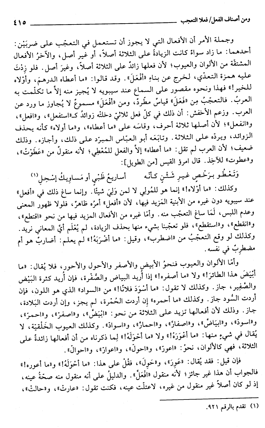 وكذلك: "ما أوْلاه! " إنما هو للمُولِي لا لمن وَلِيَ شيئًا. وإنما ساغ ذلك في "أفعل" عند سيبويه دون غيره من الأبنية المَزيد فيها، لأن "أفعل" أمرُه ظاهرٌ، فلولا ظهور المعنى وعدم اللبس، لَمَا ساغ التعجّب منه. وأمّا غيره من الأفعال المزيد فيها من نحو "اقتطع"، و"انقطع"، و"استقطع"، فلو تعجّبنا بشيء منها بحذف الزيادة، لم يُعْلَم أيَّ المعاني نريد. وكذلك لو وقع التعجّبُ من "اضطرب"، وقيل: "ما أضْرَبَهُ! " لم يعلم: أضاربٌ هو أم مضطرِبٌ في نفسه.
