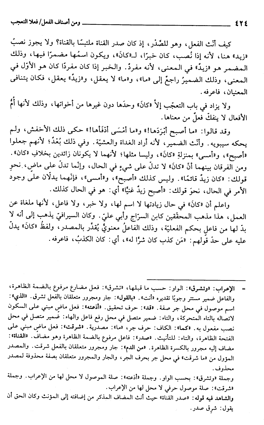 وقد قالوا: "ما أصبح أبرَدَها! " و"ما أمْسَى أدْفَأها! " حكى ذلك الأخفش، ولم يحكه سيبويه. وأنّث الضمير، لأنه أراد الغداة والعشية. وفي ذلك بُعْدٌ؛ لأنهم جعلوا "أصبح"، و"أمس" بمنزلةِ "كانَ"، وليسا مثلها؛ لأنهما لا يكونان زائدين بخلافِ "كان". ومن الفرقان بينهما أن "كانَ" لا تدلّ على شيءٍ في الحال، وإنما تدلّ على ماضٍ، نحوِ قولك: "كان زيدٌ قائمًا". وليس كذلك "أصبح"، و"أمسى"، فإنّهما يدلاّن على وجود الأمر في الحال، نحوَ قولك: "أصبح زيد غنيًا" أي: هو في الحال كذلك.