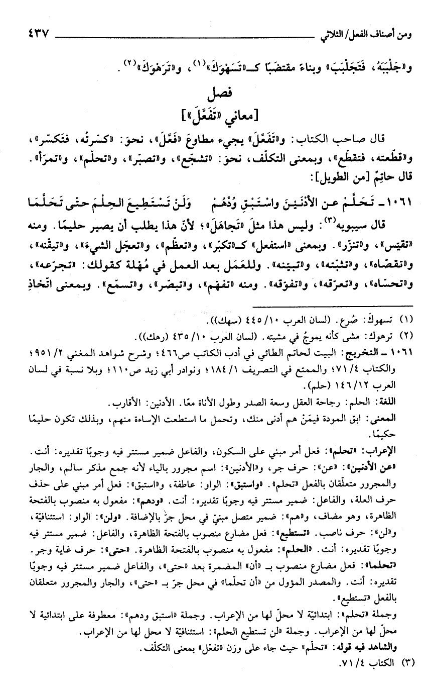 1061 - التخريج: البيت لحاتم الطائي في أدب الكاتب ص 466؛ وشرح شواهد المغني 2/ 951؛ والكتاب 4/ 71؛ والممتع في التصريف 1/ 184؛ ونوادر أبي زيد ص 110؛ وبلا نسبة في لسان العرب 12/ 146 (حلم).