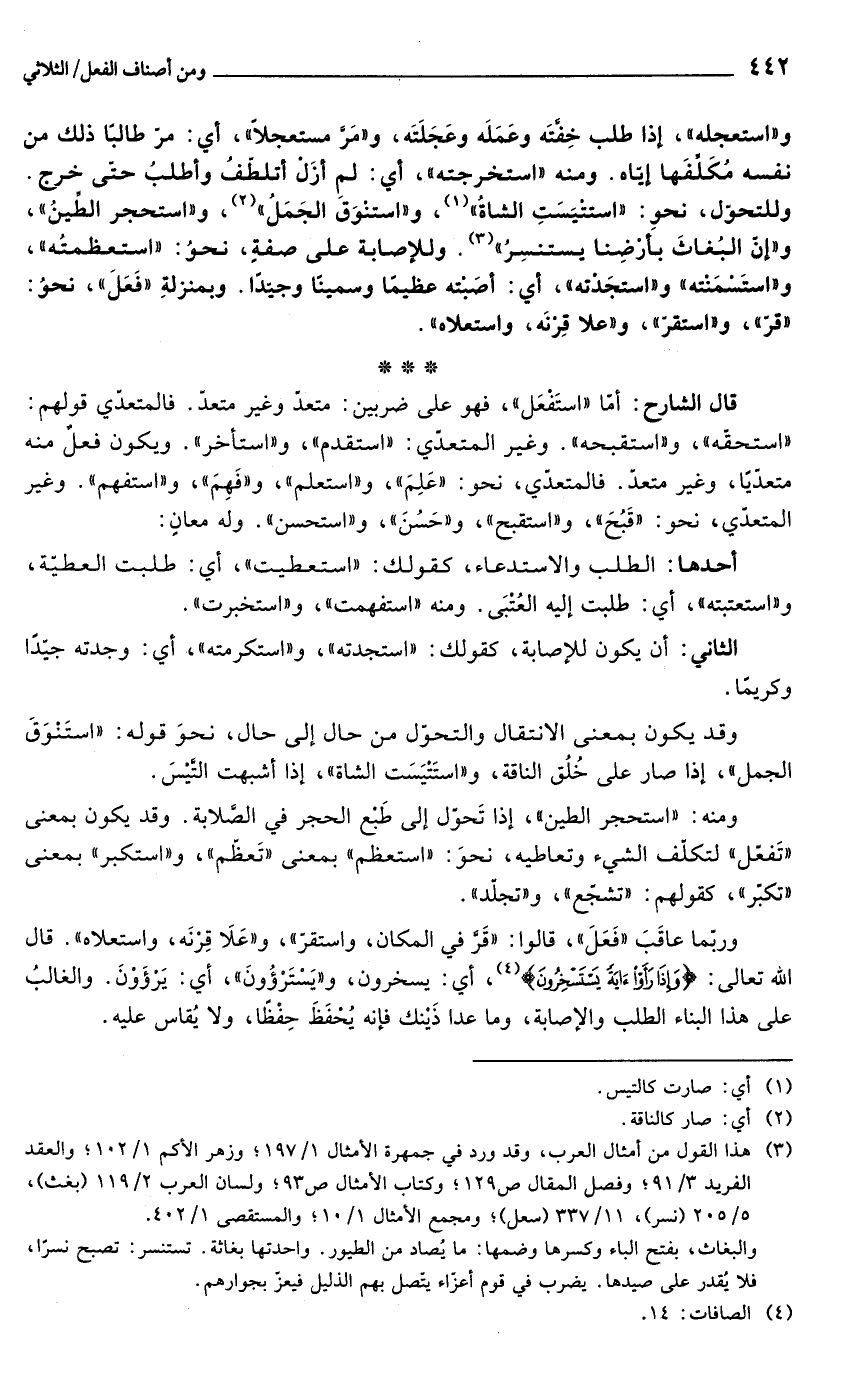 واستعجله إذا طلب عمله وخفته وعجلته, و"مر مستعجلاً" أي مر طالباً ذلك من نفسه مكلفها إياه. ومنه "استخرجته", أي لم أزل أتلطف به وأطلب حتى خرج. وللتحول نحو استتيست الشاة (¬1)، واستنوق الجمل (¬2)، واستحجر الطين، وإن البغاث بأرضنا يستنسر (¬3). وللإصابة على صفة نحو استعظمته واستسمنته واستجدته أي أصبته عظيماً وسميناً وجيداً. وبمنزلة "فَعَلَ", نحو: "قرّ" و"استقرّ", و"علا قرنه واستعلاه".