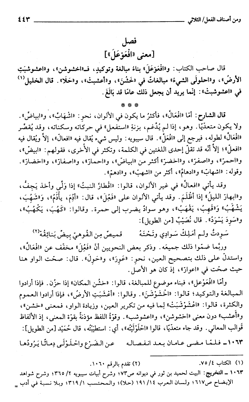 قال الشارح: أمّا "افْعَالَّ"، فأكثرُ ما يكون في الألوان، نحوِ: "اشْهَابَّ"، و"ابياضَّ". ولا يكون متعدّيًا. وهو، إذا لم يُدَّغم، بزنةِ "استفعل" في حركاته وسكناته، وقد يُقصَّر "افْعَالَّ" لطوله، فيرجع إلى "افْعَلَّ". قال سيبويه: وليس شيء يُقال فيه "افعالّ"، إلَّا ويُقال فيه "افعلّ"؛ إلَّا أنه قد تقلّ إحدى اللغتين في الكلمة، وتكثر في الأخُرى، فقولهم: "ابيض"، و"احمرّ"، و"اصفرّ"، و"اخضرّ" أكثر من "ابياضّ"، و"احمارّ"، و"اصفارّ"، و"اخضارّ". وقوله: "اشهابّ" و"ادهامَّ"، أكثر من "اشهبّ"، و"ادهمّ".