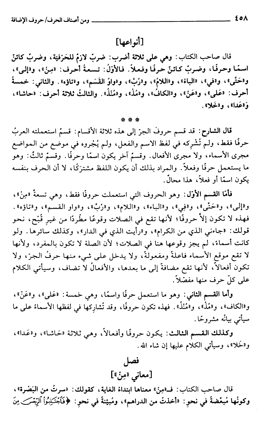 قال الشارح: قد قسم حروفَ الجرّ إلى هذه ثلاثة الأقسام: قسمٌ استعملته العربُ حرفًا فقط، ولم تُشرِكه في لفظ الاسم والفعل، ولم يُجْروه في موضع من المواضع مجرى الأسماء، ولا مجرى الأفعال. وقسمٌ آخر يكون اسمًا وحرفًا. وقسمٌ ثالثٌ: وهو ما يستعمل حرفًا وفعلًا. والمراد بذلك أن يكون اللفظ مشترَكًا، لا أن الحرف بنفسه يكون اسمًا أو فعلًا، هذا محالٌ.