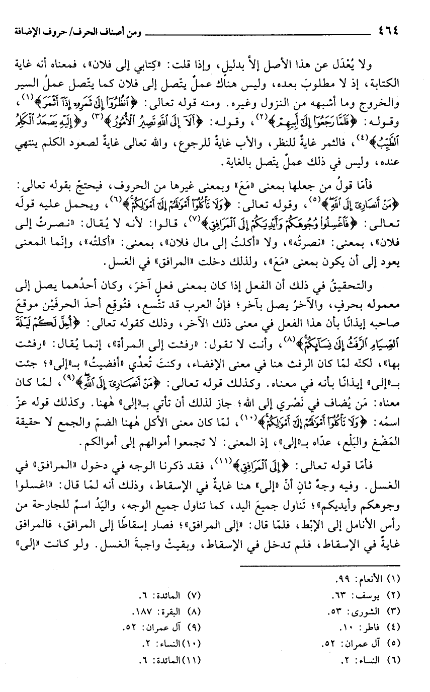 فأمّا قولُ من جعلها بمعنى "مَعَ" وبمعنى غيرها من الحروف، فيحتجّ بقوله تعالى: {مَنْ أَنْصَارِي إِلَى اللَّهِ} (¬5)، وقوله تعالى: {وَلَا تَأْكُلُوا أَمْوَالَهُمْ إِلَى أَمْوَالِكُمْ} (¬6)، ويحمل عليه قولَه تعالى: {فَاغْسِلُوا وُجُوهَكُمْ وَأَيْدِيَكُمْ إِلَى الْمَرَافِقِ} (¬7)، قالوا: لأنه لا يُقال: "نصرتُ إلى فلان"، بمعنى: "نصرتُه"، ولا "أكلتُ إلى مال فلان"، بمعنى: "أكلتُه"، وإنّما المعنى يعود إلى أن يكون بمعنى "مَعَ"، ولذلك دخلت "المرافق" في الغسل.