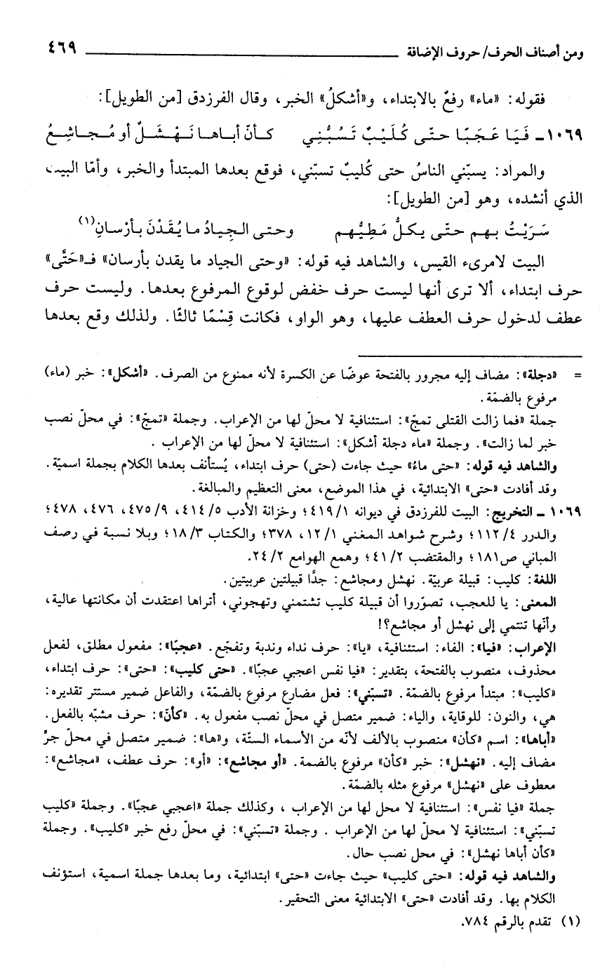 والشاهد فيه قوله: "حتى ماءُ" حيث جاءت (حتى) حرف ابتداء، يُستأنف بعدها الكلام بجملة اسميّة. وقد أفادت "حتى" الابتدائية، في هذا الموضع، معنى التعظيم والمبالغة.
