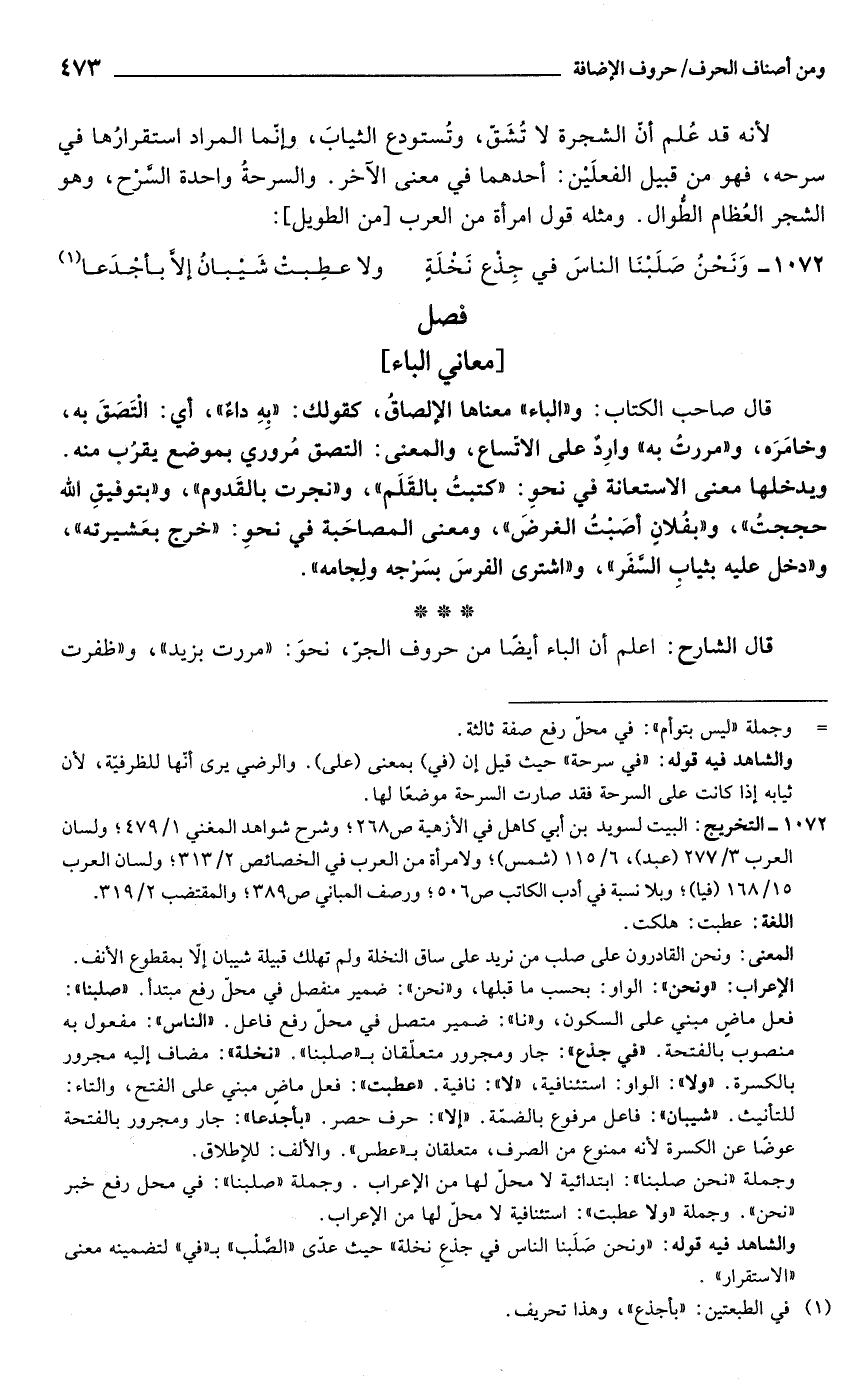 والشاهد فيه قوله: "في سرحة" حيث قيل إن (في) بمعنى (على). والرضي يرى أنّها للظرفيّة, لأن ثيابه إذا كانت على السرحة فقد صارت السرحة موضعًا لها.