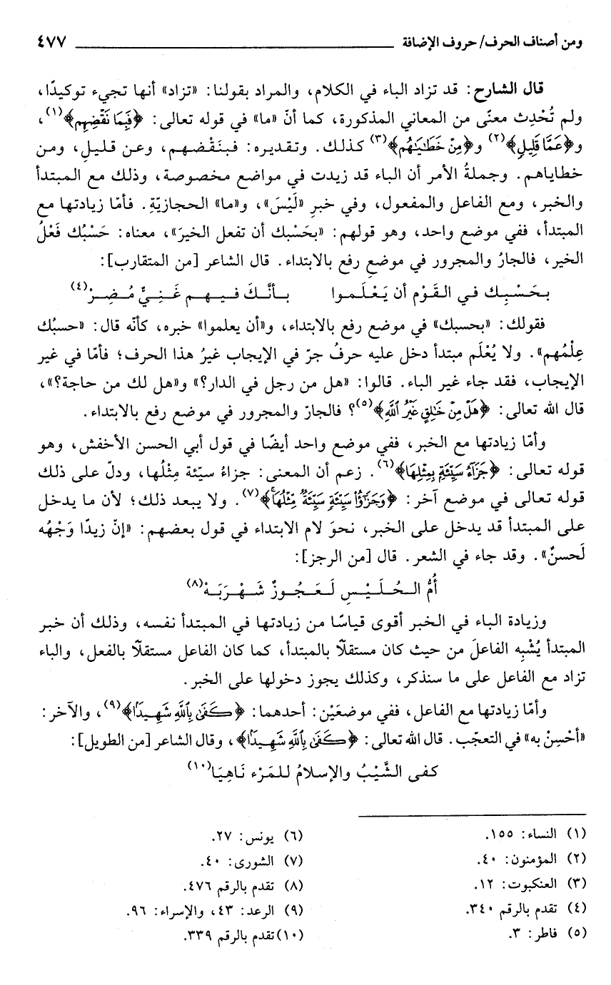 قال الشارح: قد تزاد الباء في الكلام، والمراد بقولنا: "تزاد" أنها تجيء توكيدًا، ولم تُحْدِث معنى من المعاني المذكورة، كما أن "ما" في قوله تعالى: {فَبِمَا نَقْضِهِمْ} (¬1)، و {عَمَّا قليل} (¬2) و {مِنْ خَطَايَاهُمْ} (¬3) كذلك. وتقديره: فبنَقْضهم، وعن قليلِ، ومن خطاياهم. وجملةُ الأمران الباء قد زيدت في مواضع مخصوصة، وذلك مع المبتدأ والخبر، ومع الفاعل والمفعول، وفي خبرِ "لَيْسَ"، و"ما" الحجازيةِ. فأمّا زيادتها مع المبتدأ، ففي موضع واحد، وهو قولهم: "بحَسْبك أن تفعل الخيرَ"، معناه: حَسْبُك فَعْلُ الخير، فالجارُ والمجرور في موضعِ رفع بالابتداء. قال الشاعر [من المتقارب]: