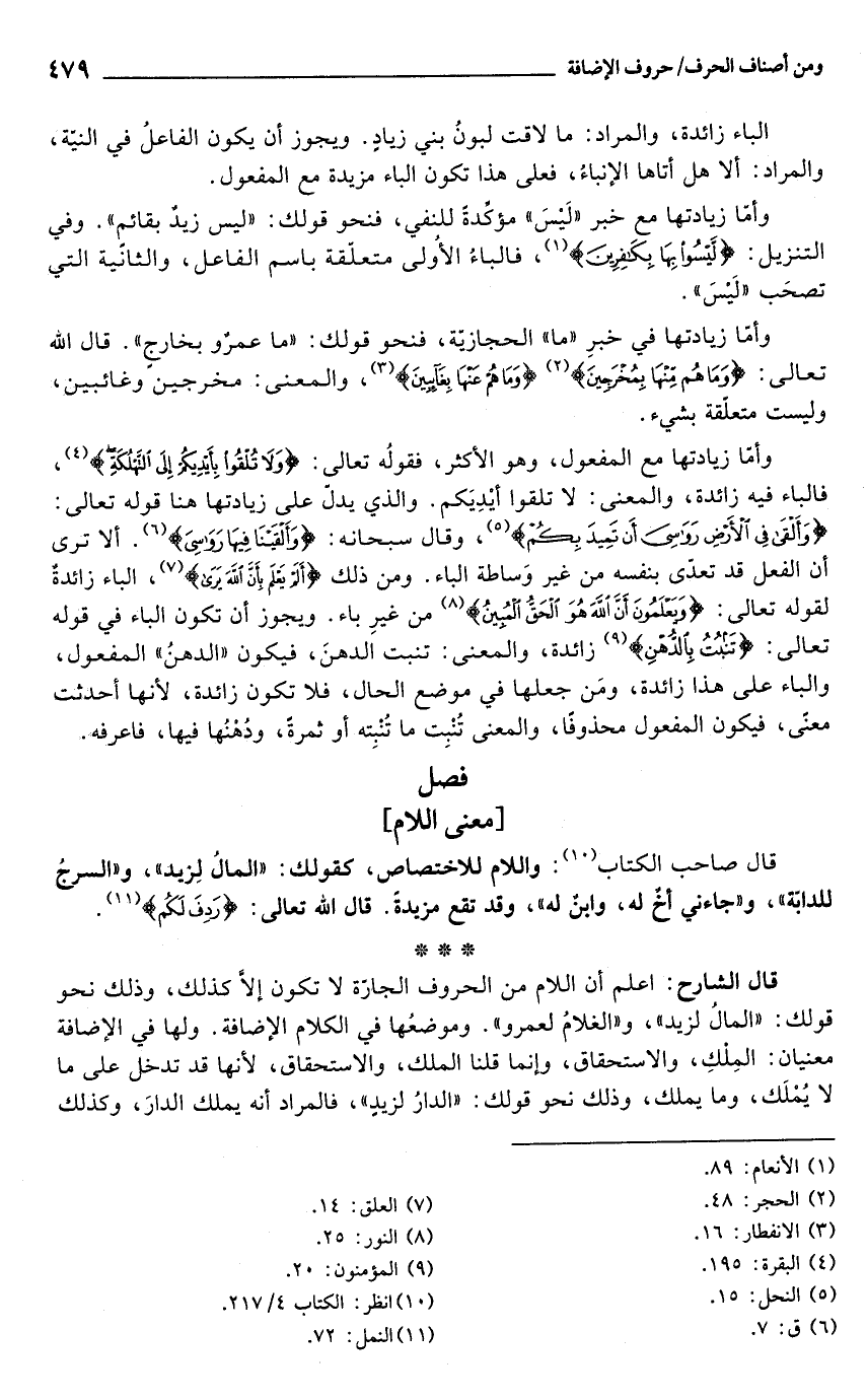 قال الشارح: اعلم أن اللام من الحروف الجارّة لا تكون إلَّا كذلك، وذلك نحو قولك: "المالُ لزيد"، و"الغلامُ لعمرو". وموضعُها في الكلام الإضافة. ولها في الإضافة معنيان: المِلْكِ، والاستحقاق، وإنما قلنا الملك، والاستحقاق؛ لأنها قد تدخل على ما لا يُمْلَك، وما يملك، وذلك نحو قولك: "الدارُ لزيدٍ"، فالمراد أنه يملك الدارَ، وكذلك