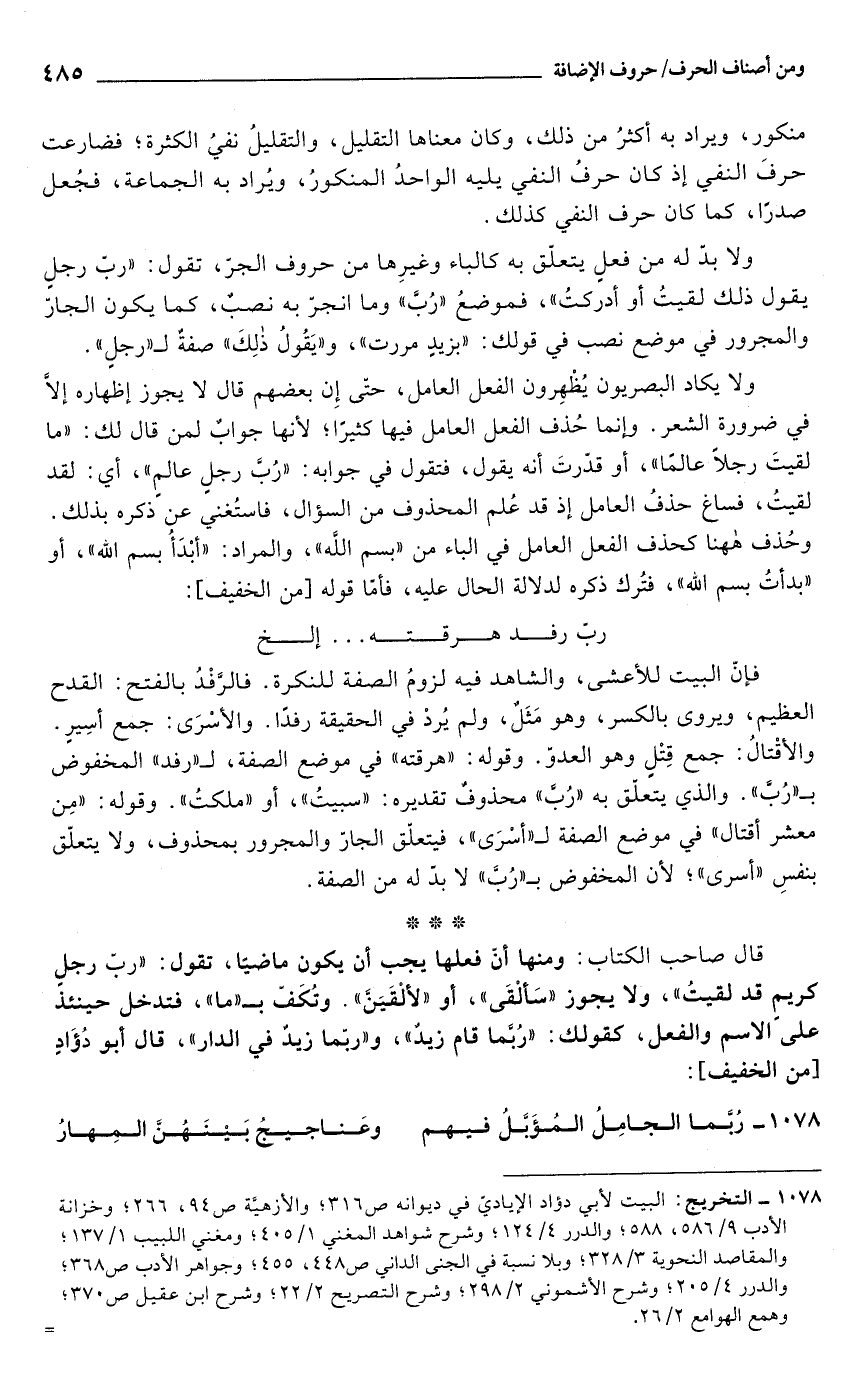 قال صاحب الكتاب: ومنها أن فعلها يجب أن يكون ماضياً، تقول: "ربّ رجلٍ كريمٍ قد لقيت"، ولا يجوز "سألقى", أو "لألقين". وتكف بـ "ما", فتدخل حينئذ على الاسم والفعل, كقولك: "ربما قام زيدٌ"، و"ربما زيدٌ في الدار", قال أبو دؤاد [من الخفيف]: