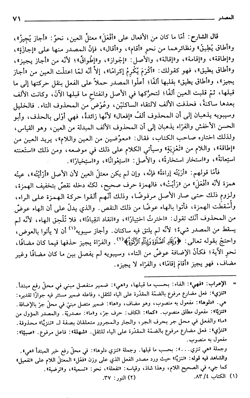 قال الشارح: أما ما كان من الأفعال على "أفعَلَ" معتلَّ العين، نحوُ: "أجاز يُجِيزُ"، و"أطاق يطِيقُ" ونظائرهما من نحوِ "أقام"، و"أقال"، فإنّ المصدر منها على "إجازَةٍ"، و"إطاقة"، و"إقامة"، و"إقالة"، والأصل: "إجْواز"، و"إطواقٌ"؛ لأنه من "أجاز يجيز"، و"أطاق يطيق"، فهو كقولك: "أكرَمَ يُكرِمُ إكرامًا"، إلَّا أنّه لمّا اعتلّت العين من "أجاز يجيز"، و"أطاق يطيق" بقلبها ألفًا؛ أعلوا المصدر حملًا على الفعل بنقل حركتها إلى ما قبلها، ثم قلبت العين ألفًا؛ لتحرُّكها في الأصل وانفتاحِ ما قبلها الآنَ، وكانت الألف بعدها ساكنةً، فحذفت الألف لالتقاء الساكنَين، وعُوّض من المحذوف التاء. فالخليل وسيبويه يذهبان إلى أن المحذوف ألفُ "إفعال" لأنّها زائدةٌ، فهي أولى بالحذف، وأبو الحسن الأخفش والفرّاء يذهبان إلى أن المحذوف الألف المبدلة من العين، وهو القياس، ولذلك اختاره صاحب الكتاب، فقال: "معوِّضين من العين واللام"، يريد العين من "إطاقة"، واللام من "تَعْزِيَةٍ" وسيأتي الكلام على ذلك في موضعه، ومن ذلك "استَعنته استِعانةً"، و"استخار استخارةً"، والأصل: "استِعوانًا"، و"استِخيارًا".