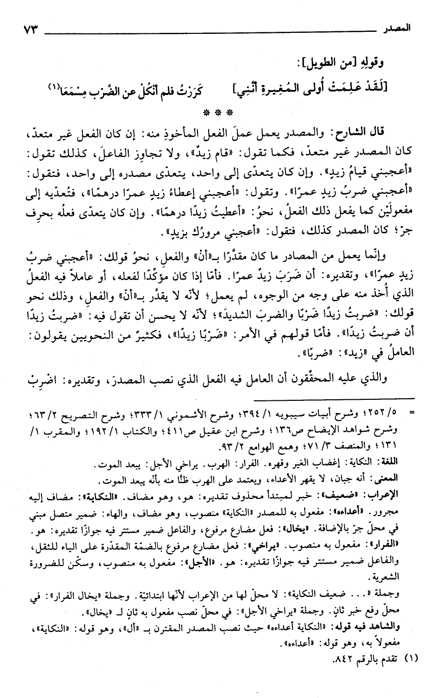 والشاهد فيه قوله: "النكاية أعداءه" حيث نصب المصدر المقترن بـ"أل"، وهو قوله: "النكاية"، مفعولًا به، وهو قوله: "أعداءه".
