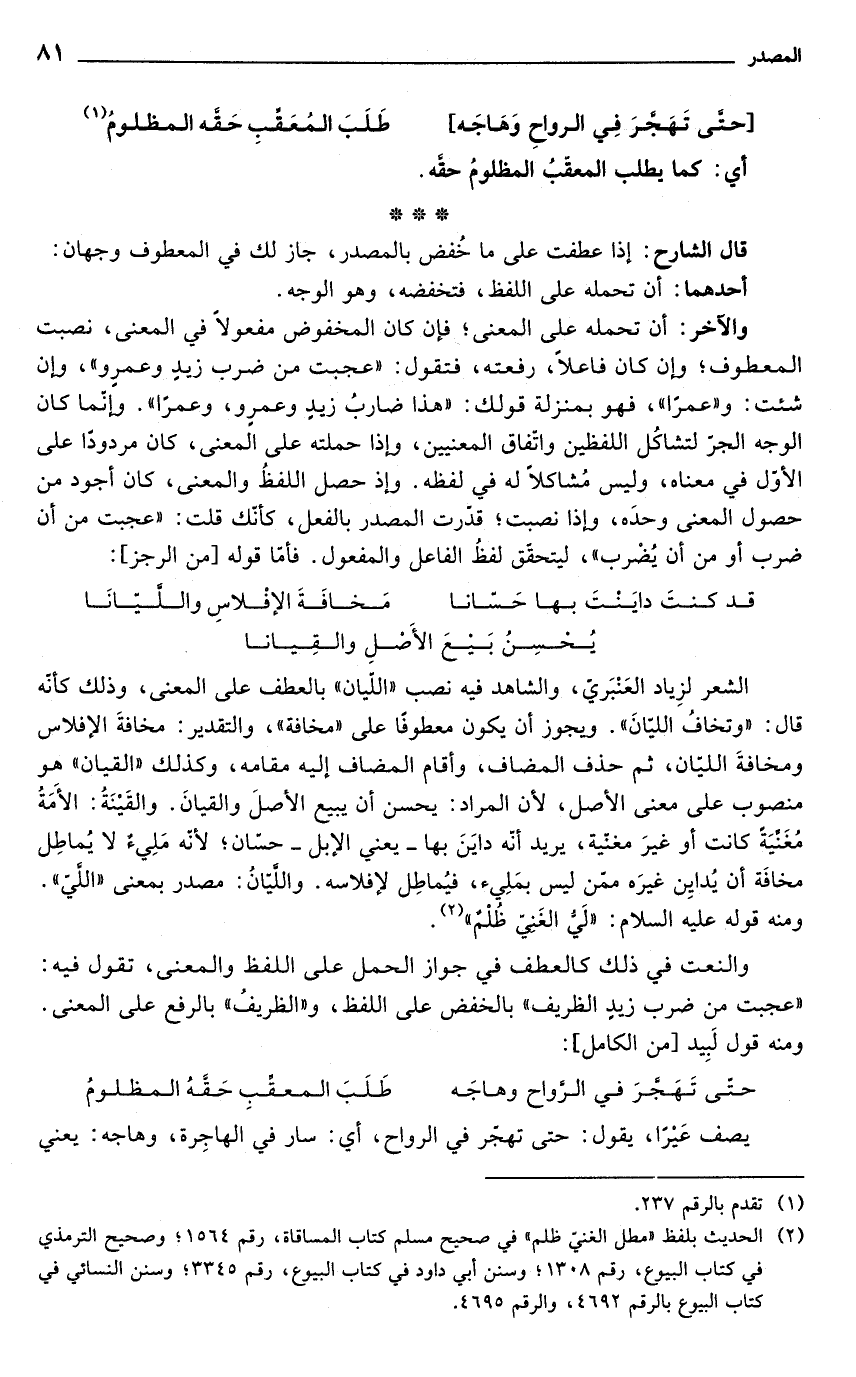 الشعر لزِياد العَنْبَري، والشاهد فيه نصب "اللّيان" بالعطف على المعنى، وذلك كأنّه قال: "وتخافُ الليانَ". ويجوز أن يكون معطوفًا على "مخافة"، والتقدير: مخافةَ الإفلاس ومخافةَ الليّان، ثم حذف المضاف، وأقام المضاف إليه مقامه، وكذلك "القيان" هو منصوب على معنى الأصل, لأن المراد: يحسن أن يبيع الأصلَ والقيانَ. والقَيْنَةُ: الأَمَةُ مُغَنْيَة كانت أو غيرَ مغنية، يريد أنَّه دايَنَ بها -يعني الإبل- حسّان؛ لأنه مَلِيءٌ لا يُماطِل مخافَة أن يُدايِن غيرَه ممّن ليس بمَلِيء، فيُماطِل لإفلاسه. واللَّيانُ: مصدر بمعنى "اللَّي". ومنه قوله عليه السلام: "لَيُّ الغَنِي ظُلْمٌ" (¬2).