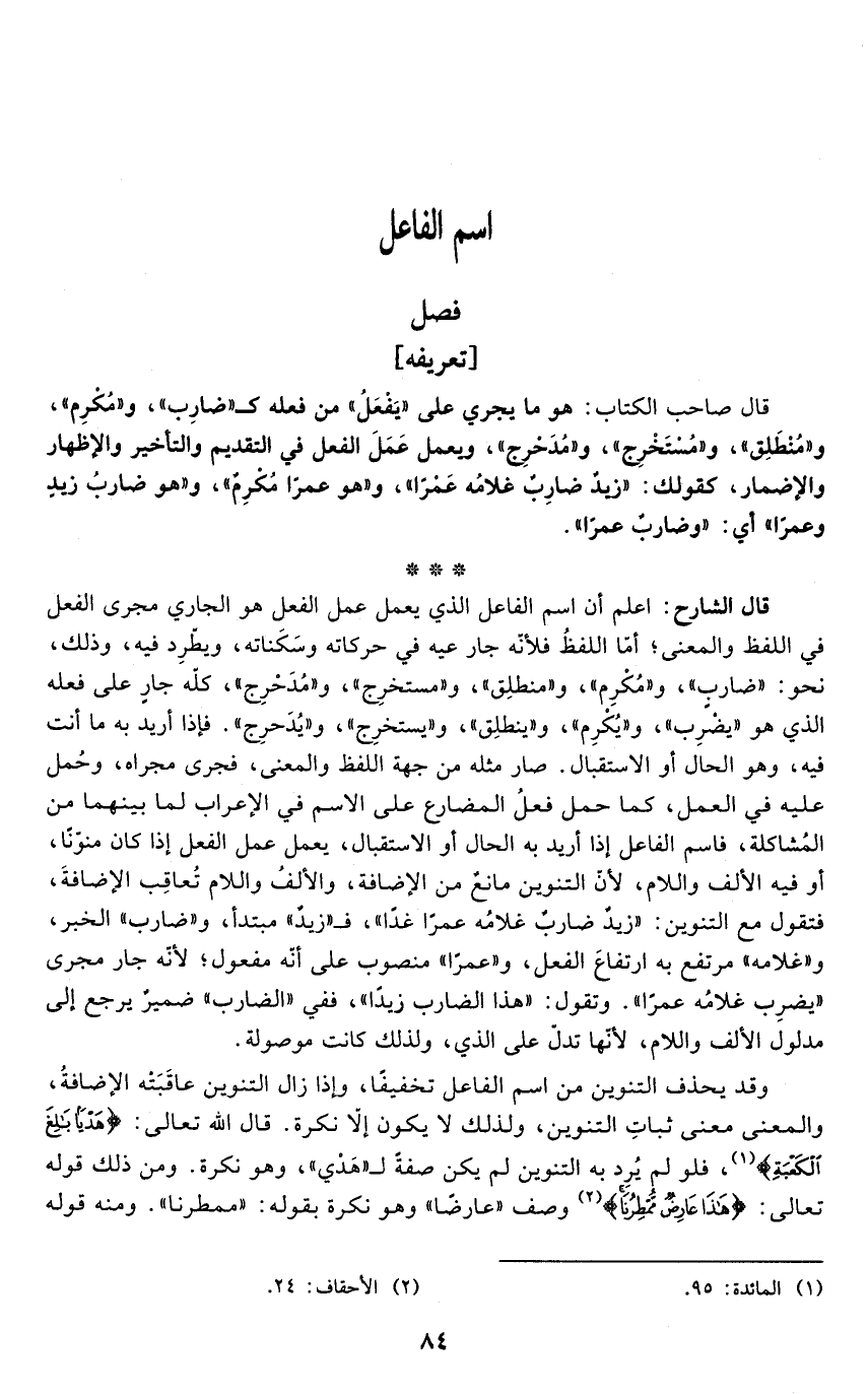 قال الشارح: اعلم أن اسم الفاعل الذي يعمل عمل الفعل هو الجاري مجرى الفعل في اللفظ والمعنى؛ أمّا اللفظُ فلأنه جار عيه في حركاته وسكَناته، ويطّرِد فيه، وذلك، نحو: "ضارب"، و"مُكْرِم"، و"منطلِق"، و"مستخرِج"، و"مُدَحْرِج"، كله جارٍ على فعله الذي هو"يضْرِب"، و"يُكْرِم"، و"ينطلِق"، و"يستخرِج"، و"يُدَحرِج". فإذا أريد به ما أنت فيه، وهو الحال أو الاستقبال. صار مثله من جهة اللفظ والمعنى، فجرى مجراه، وحُمل عليه في العمل، كما حمل فعلُ المضارع على الاسم في الإعراب لما بينهما من المُشاكلة، فاسم الفاعل إذا أريد به الحال أو الاستقبال، يعمل عمل الفعل إذا كان منوّنًا، أو فيه الألف واللام, لأنّ التنوين مانعٌ من الإضافة، والألفُ واللام تُعاقِب الإضافةَ، فتقول مع التنوين: "زيدٌ ضاربٌ غلامُه عمرًا غدًا"، فـ"زيد" مبتدأ، و"ضارب" الخبر، و"غلامه" مرتفع به ارتفاعَ الفعل، و"عمرًا" منصوب على أنّه مفعول؛ لأنّه جار مجرى "يضرِب غلامُه عمرًا". وتقول: "هذا الضارب زيدًا"، ففي "الضارب" ضميرٌ يرجع إلى مدلول الألف واللام, لأنها تدل على الذي، ولذلك كانت موصولة.